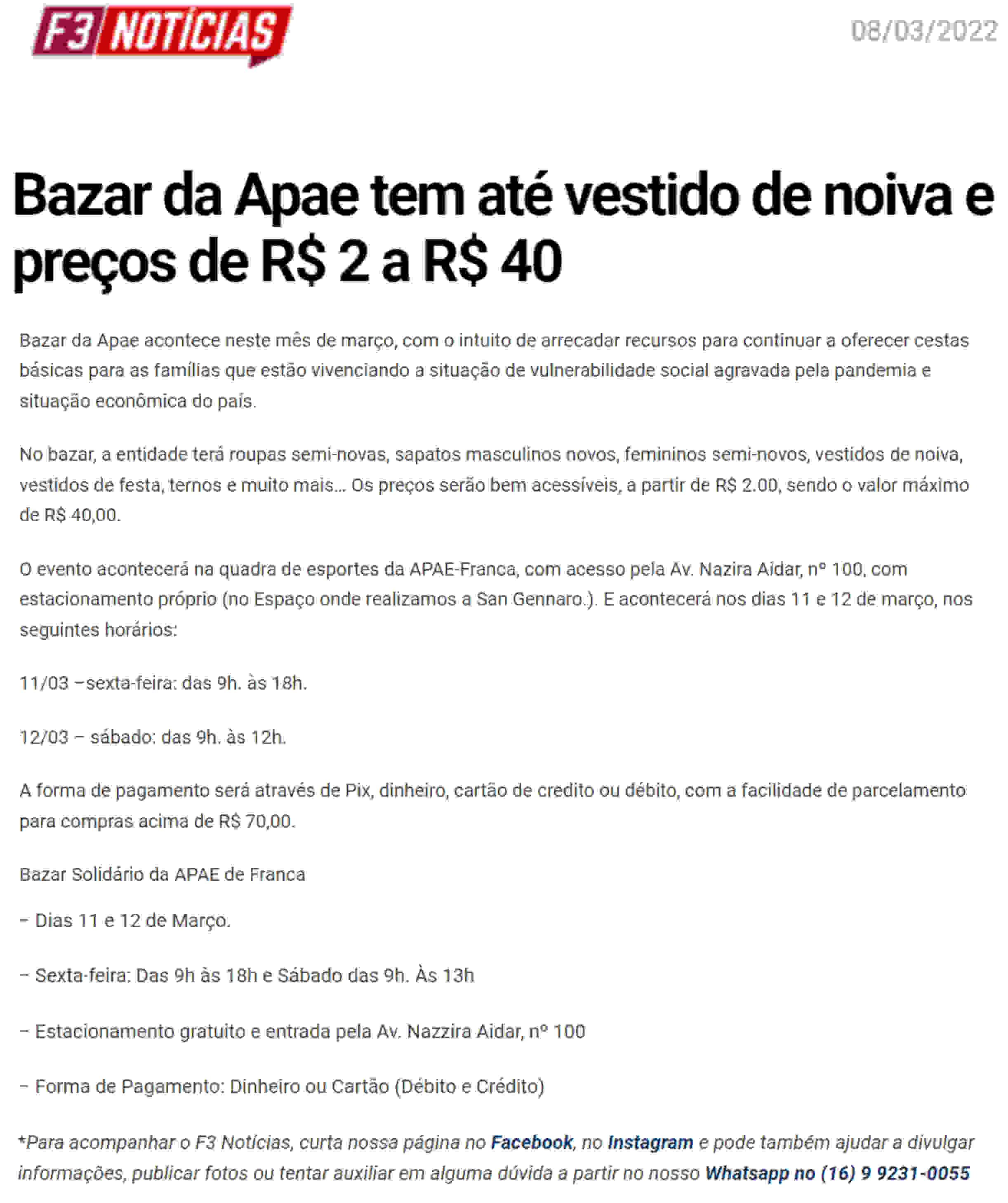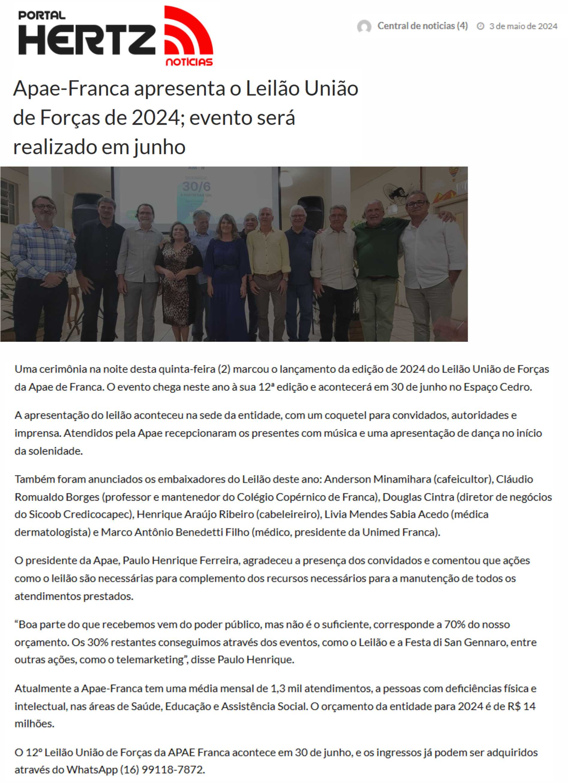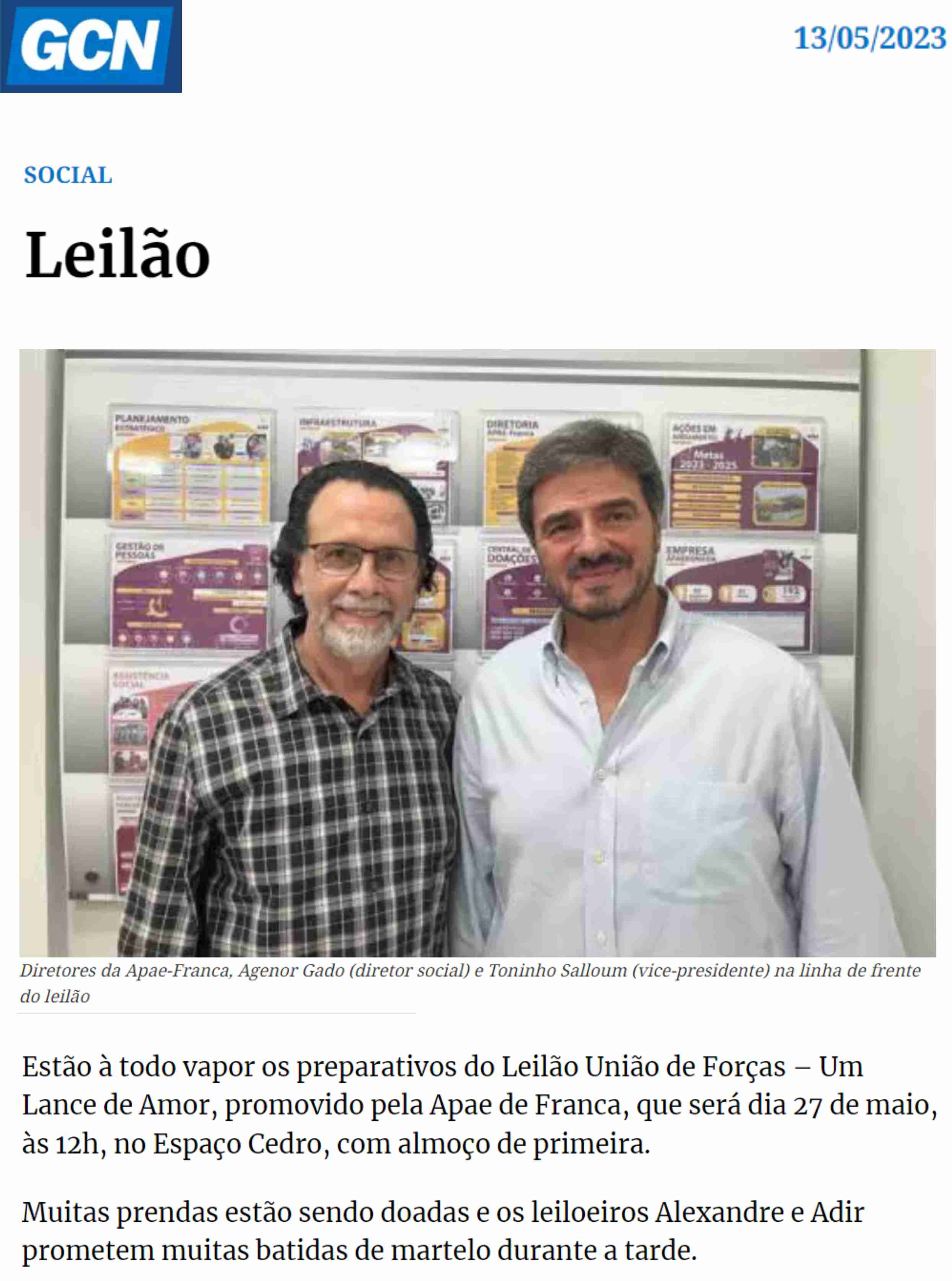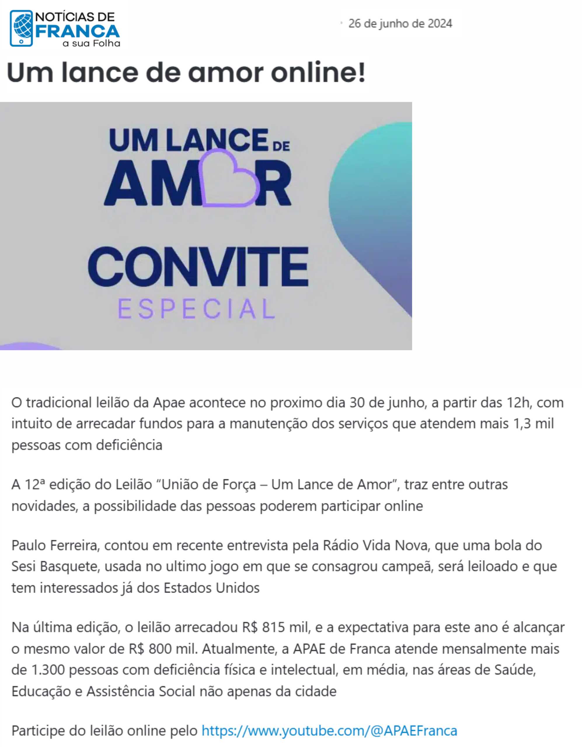 15.05.25 F3 Notícias APAE Franca faz leilão no dia 24.5 para ampliar atendimento para mais...