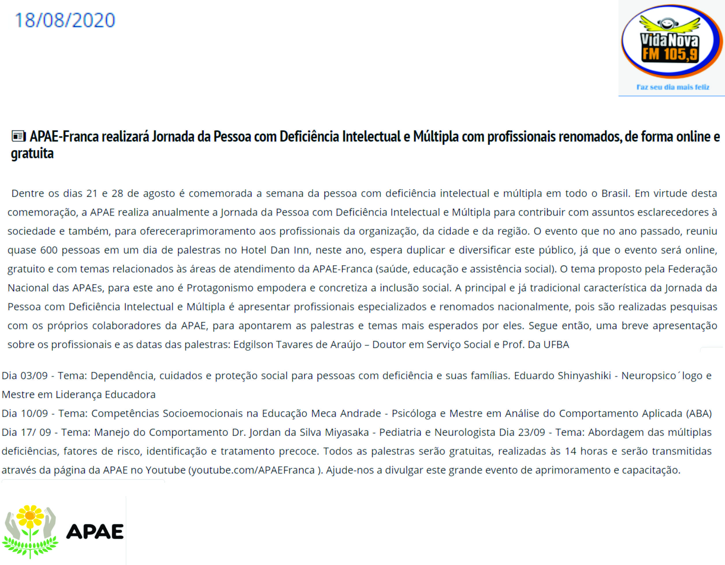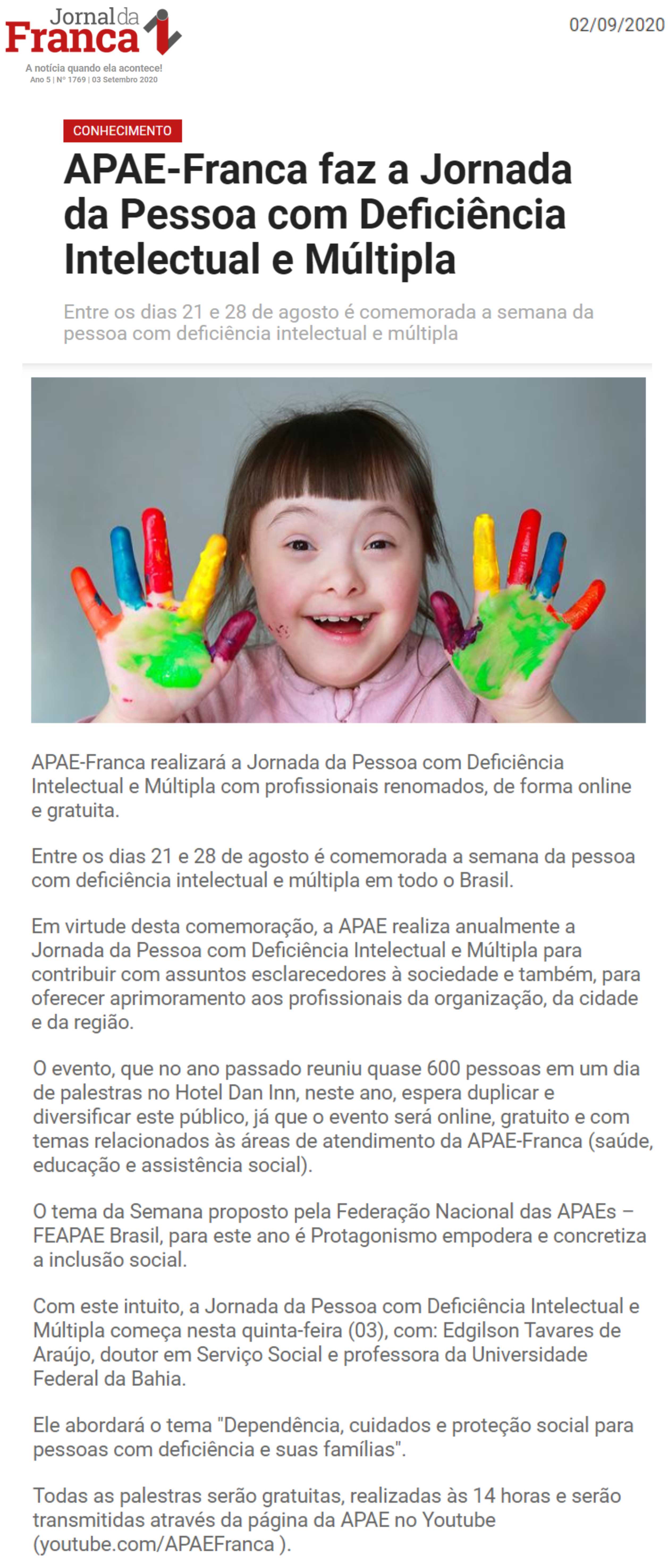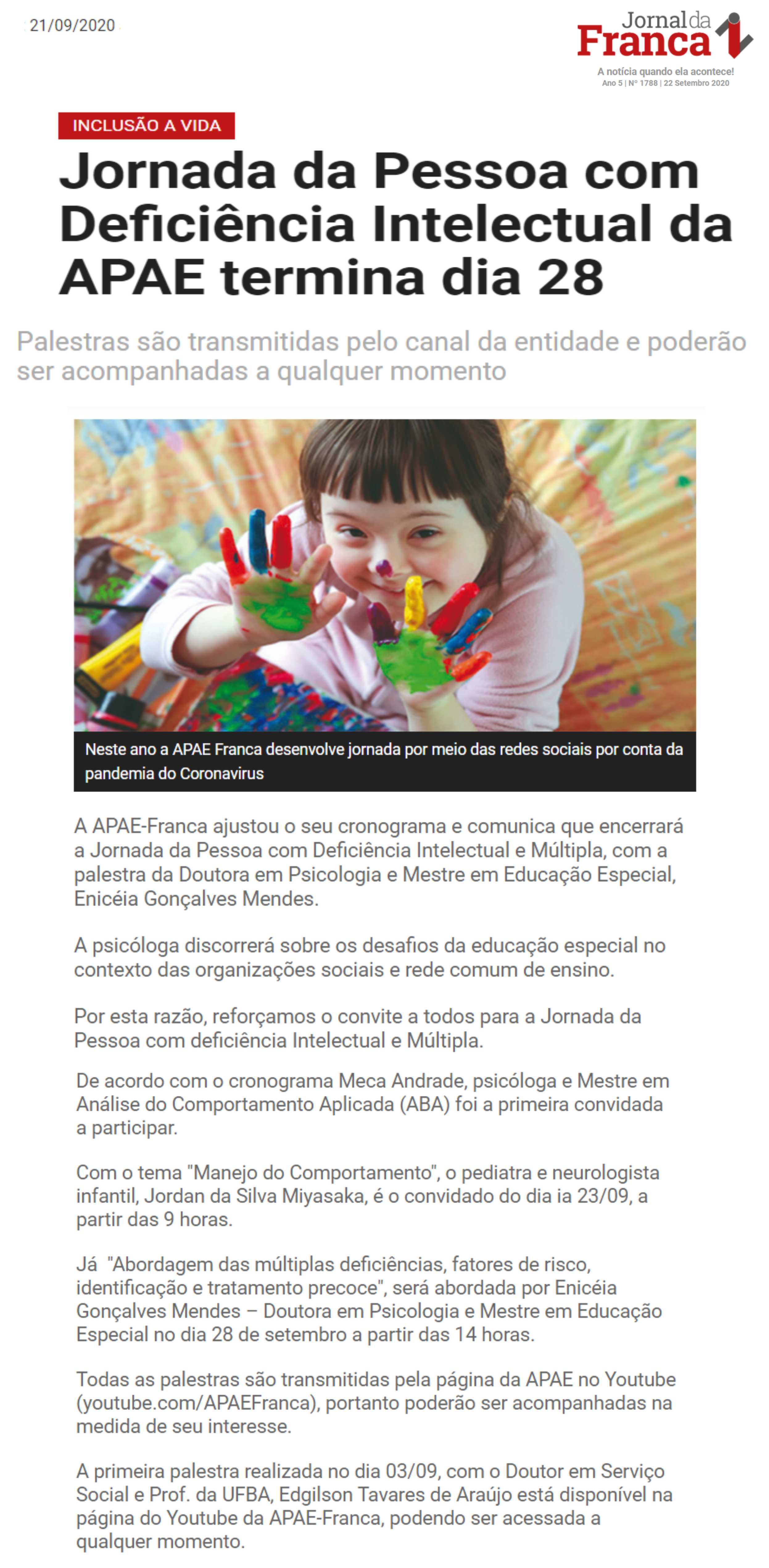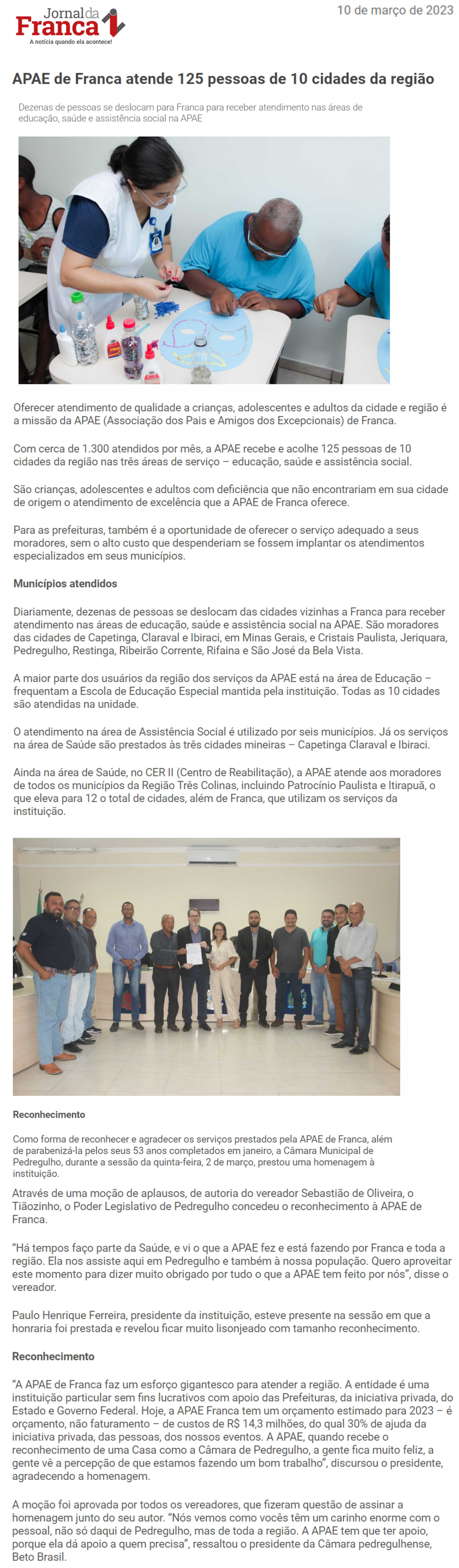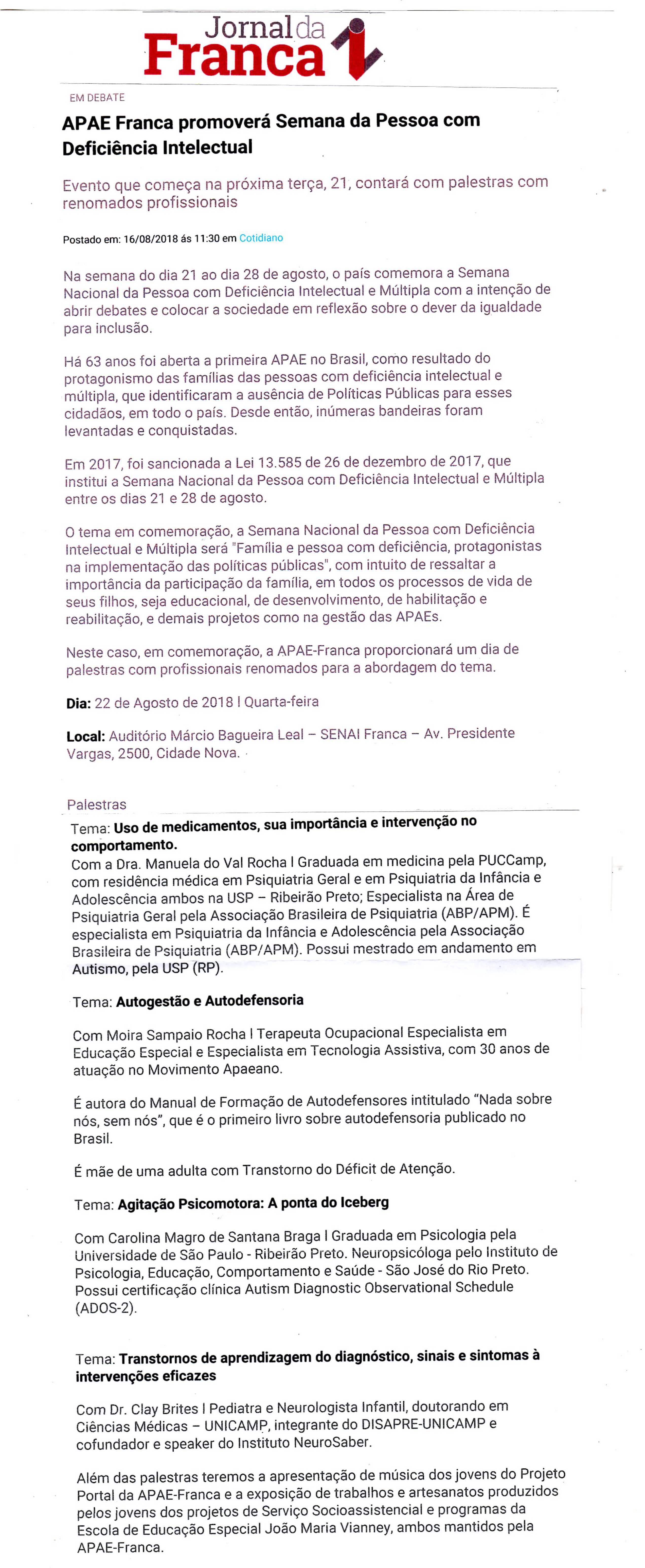 Publicações sobre a APAE-Franca nos veículos de comunicação de Franca e Região.
