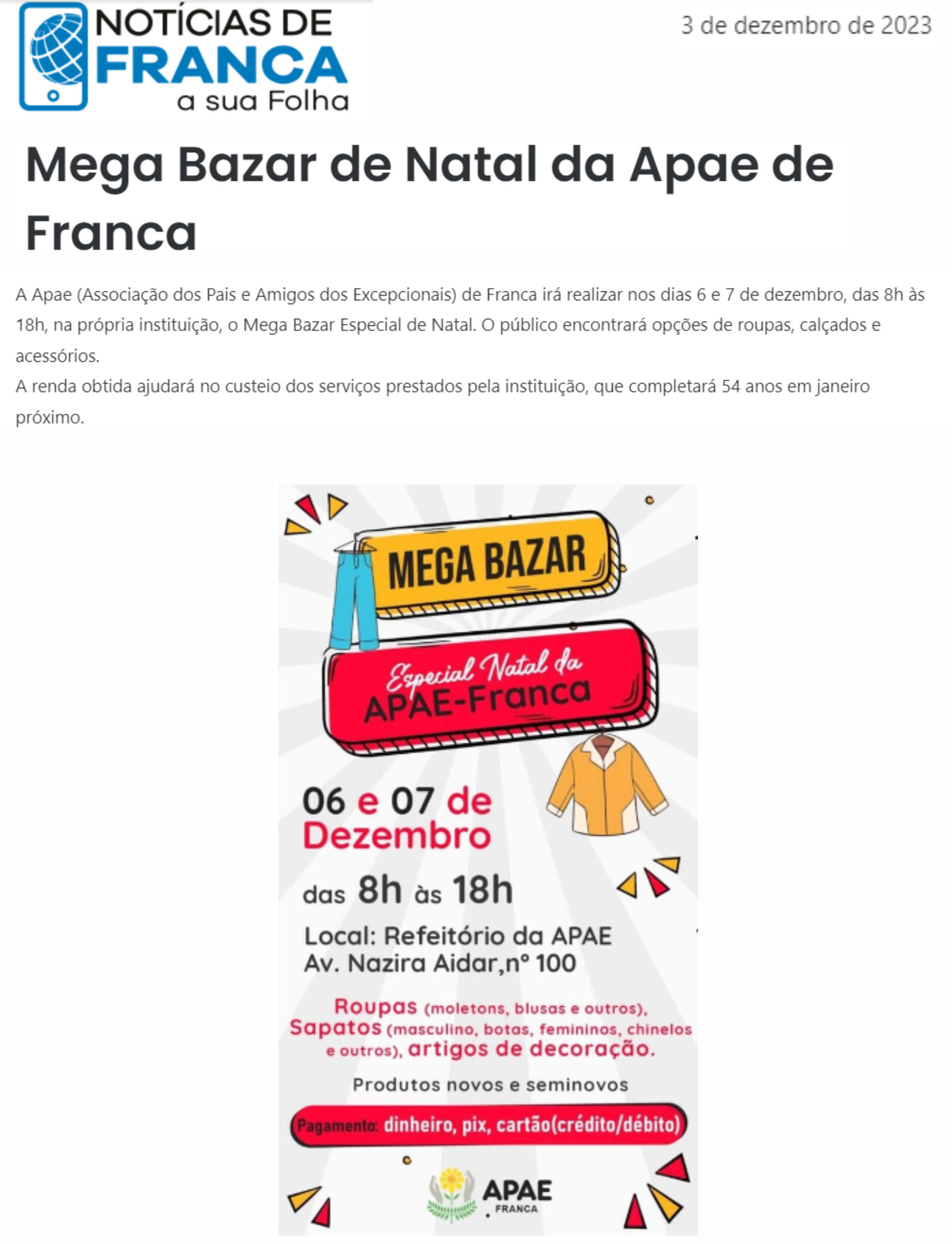 25.11.25 Vi no Site Mega Bazar de Natal da APAE Franca oferece compras solidárias com preç...