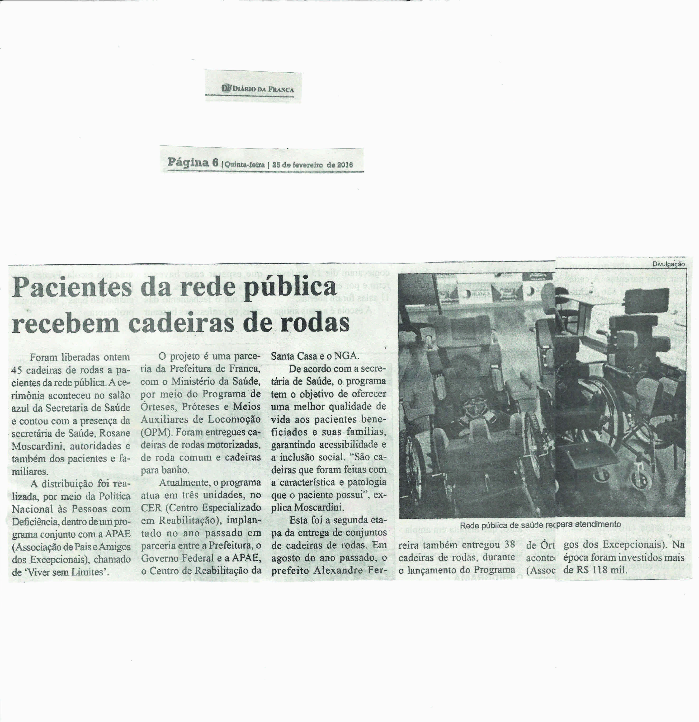 25/02/16 - DIÁRIO DA FRANCA - Pacientes da rede pública recebem cadeiras de rodas - 2502-p...