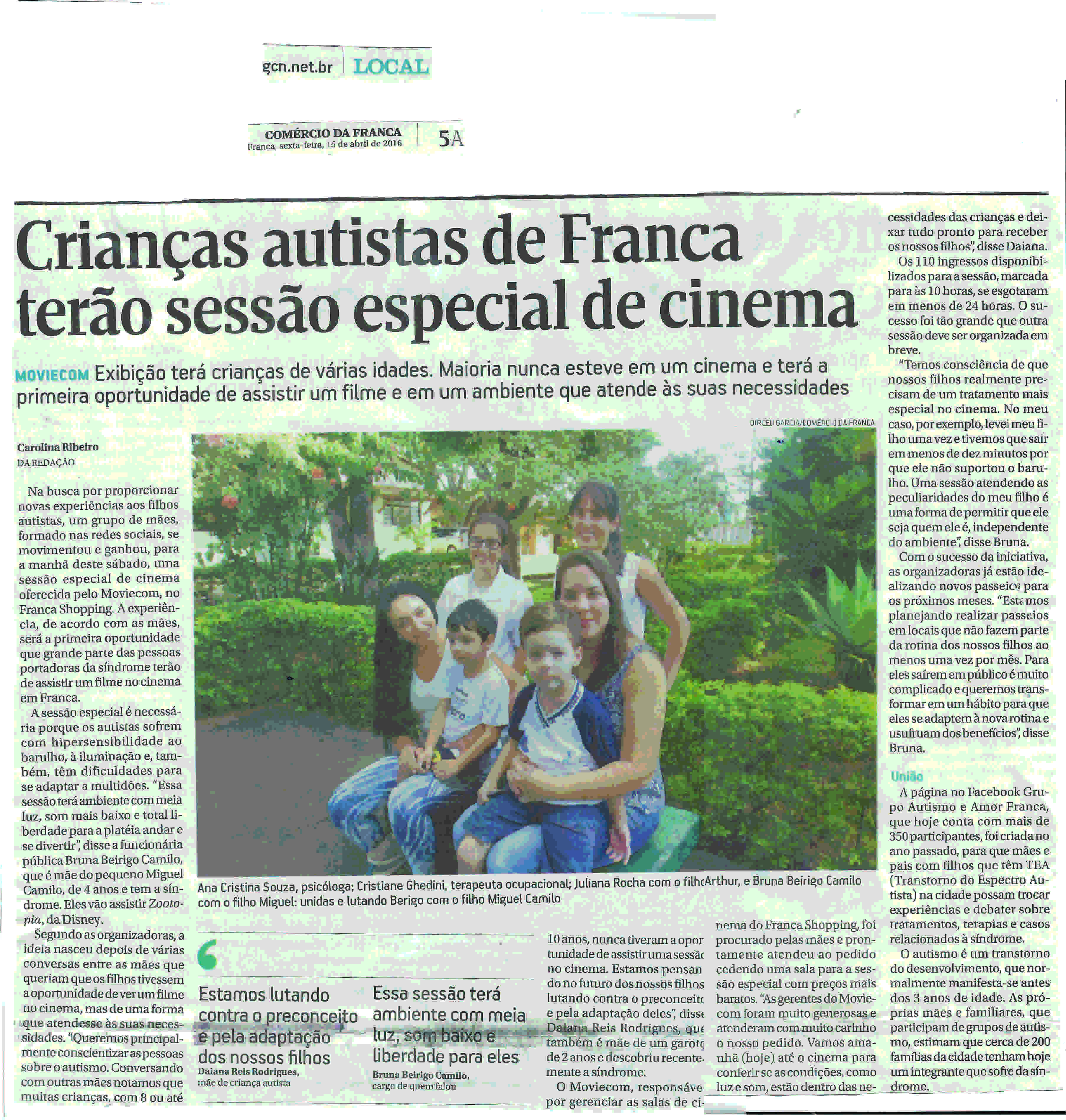 15/04/16 - COMÉRCIO DA FRANCA - Crianças Autistas de Franca terão sessão especial de cinem...