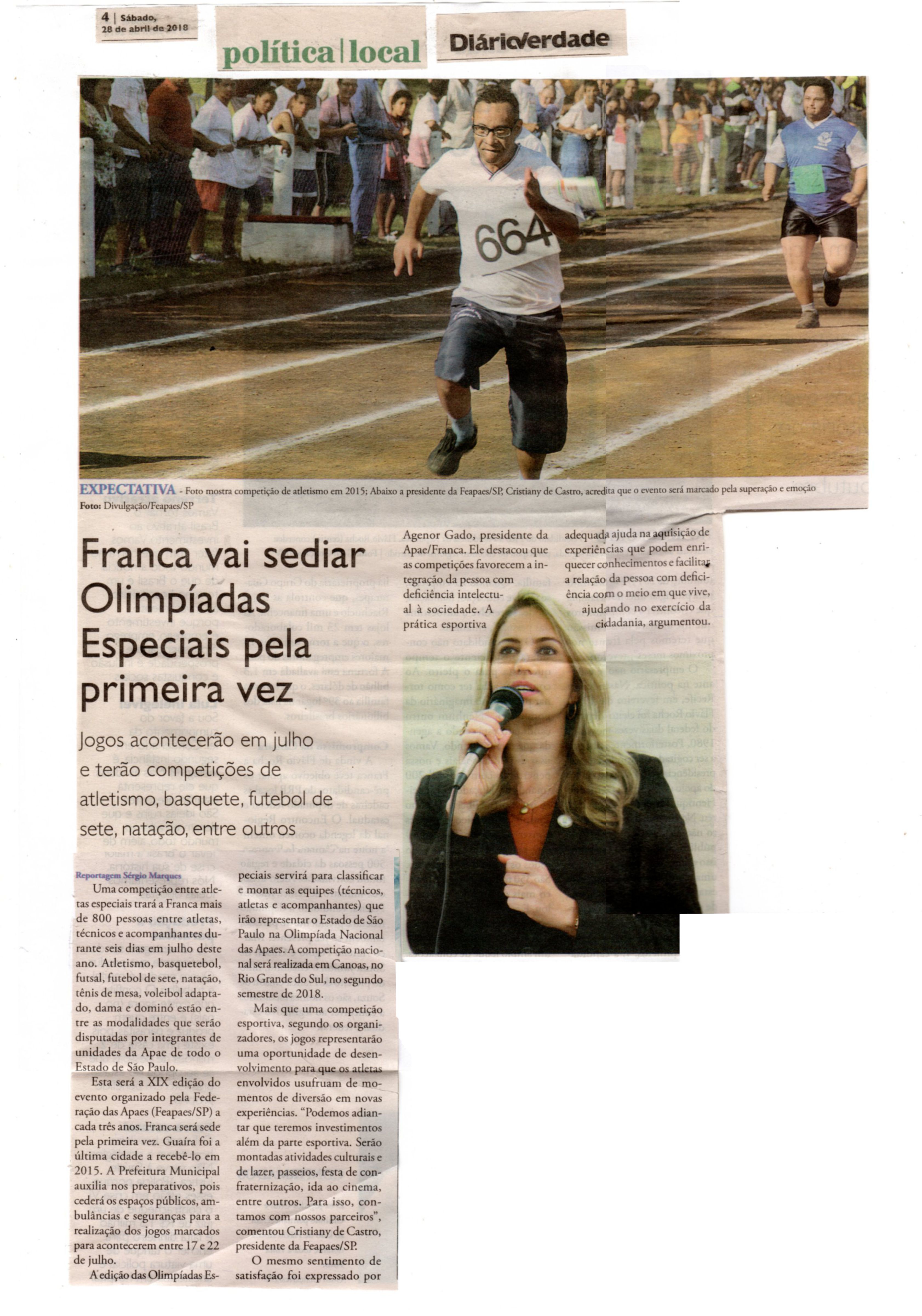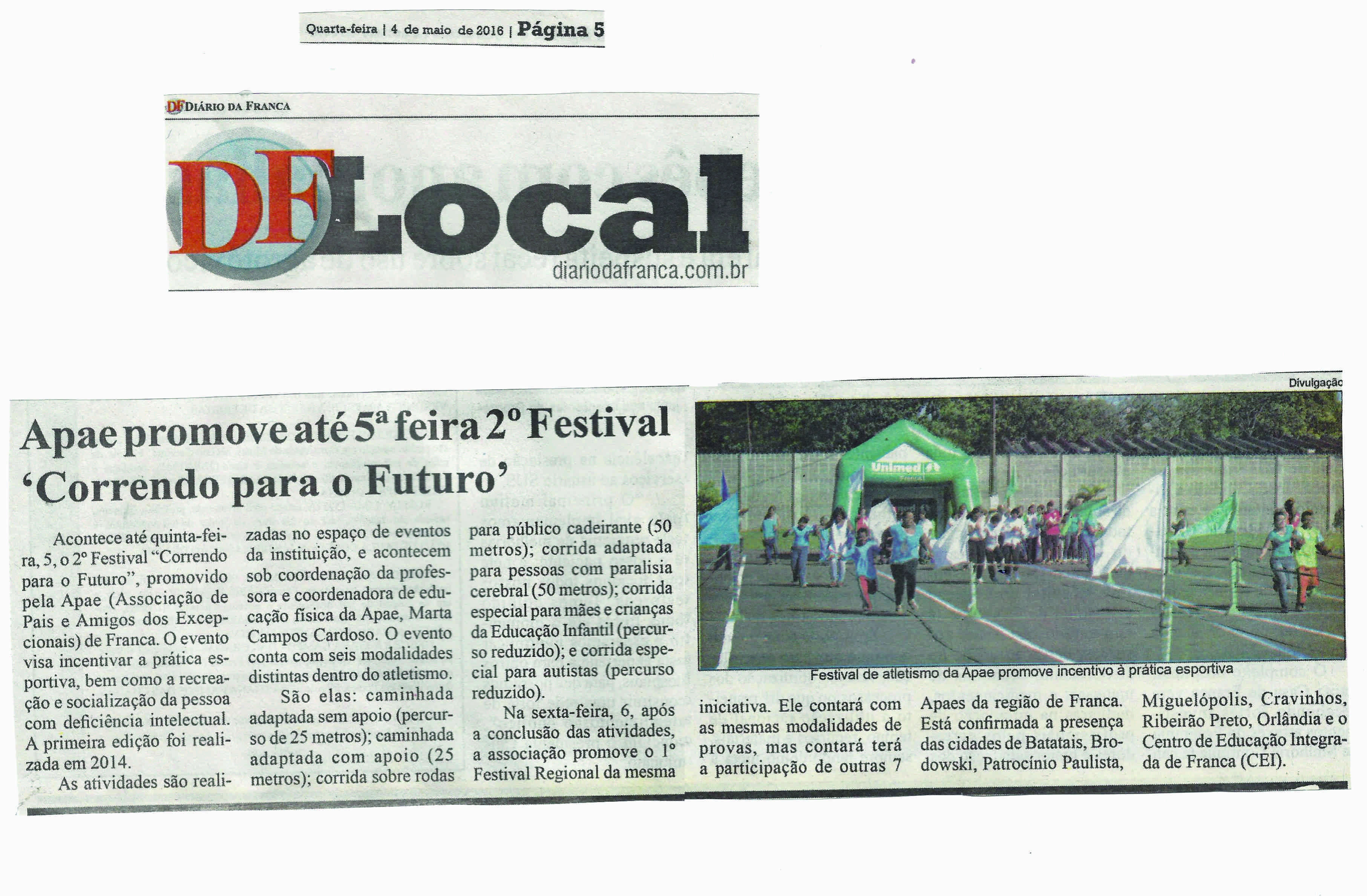 04/05/16 - DIÁRIO DA FRANCA - Apae promove até 5ª feira 2º festival correndo para o futuro...