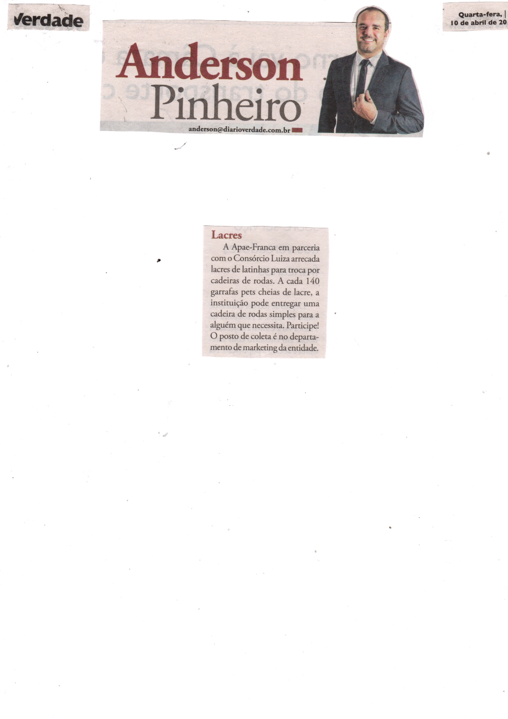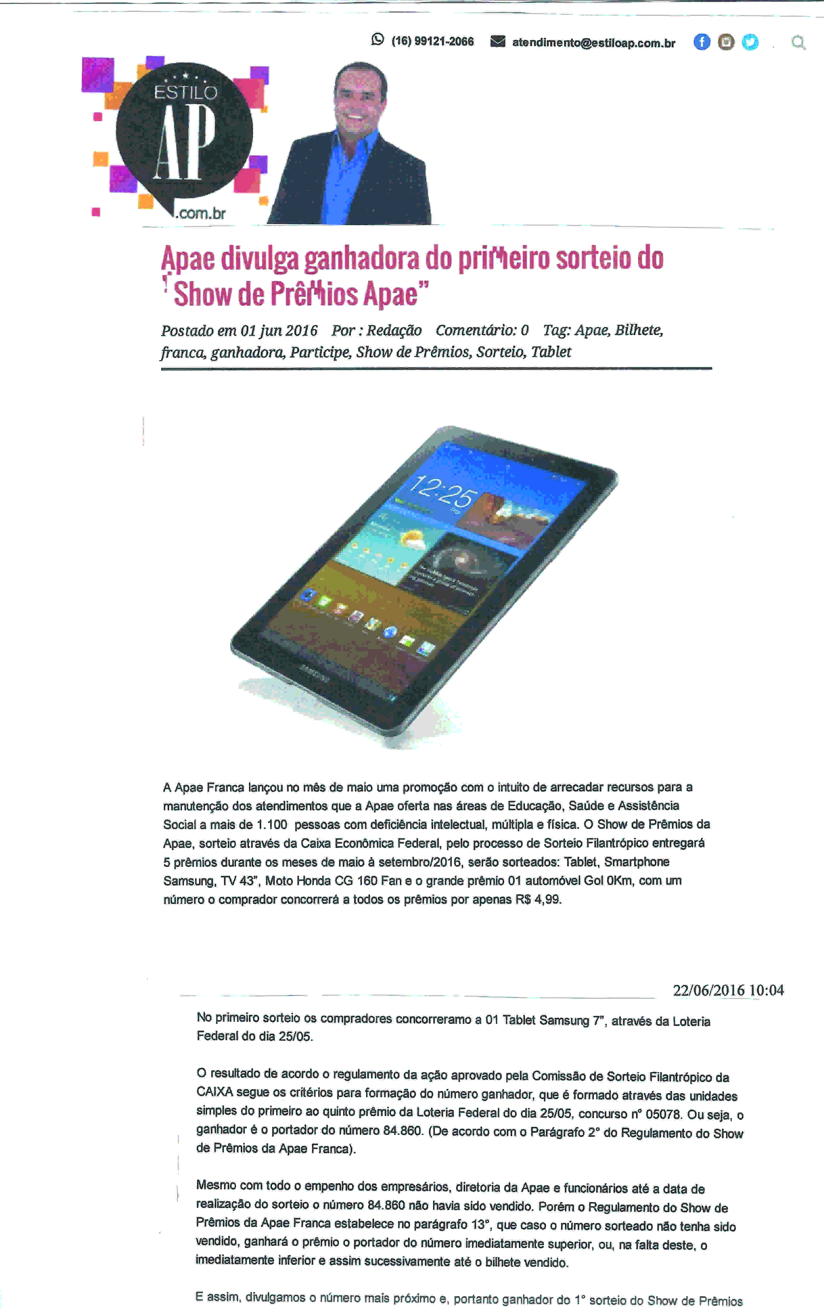 31/05/16 - JORNAL DA FRANCA - Apae Franca divulga ganhadora do primeiro prêmio de sua prom...