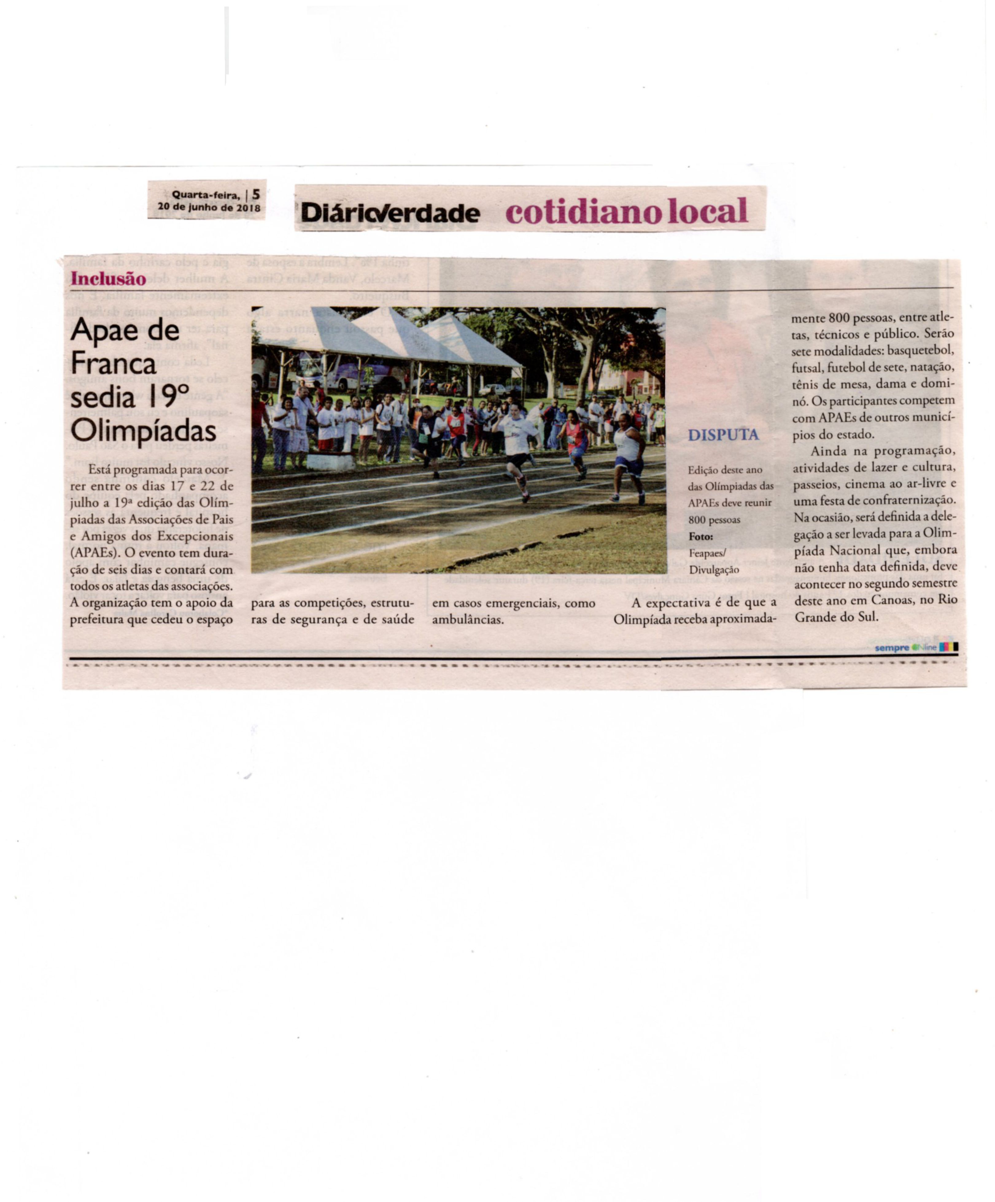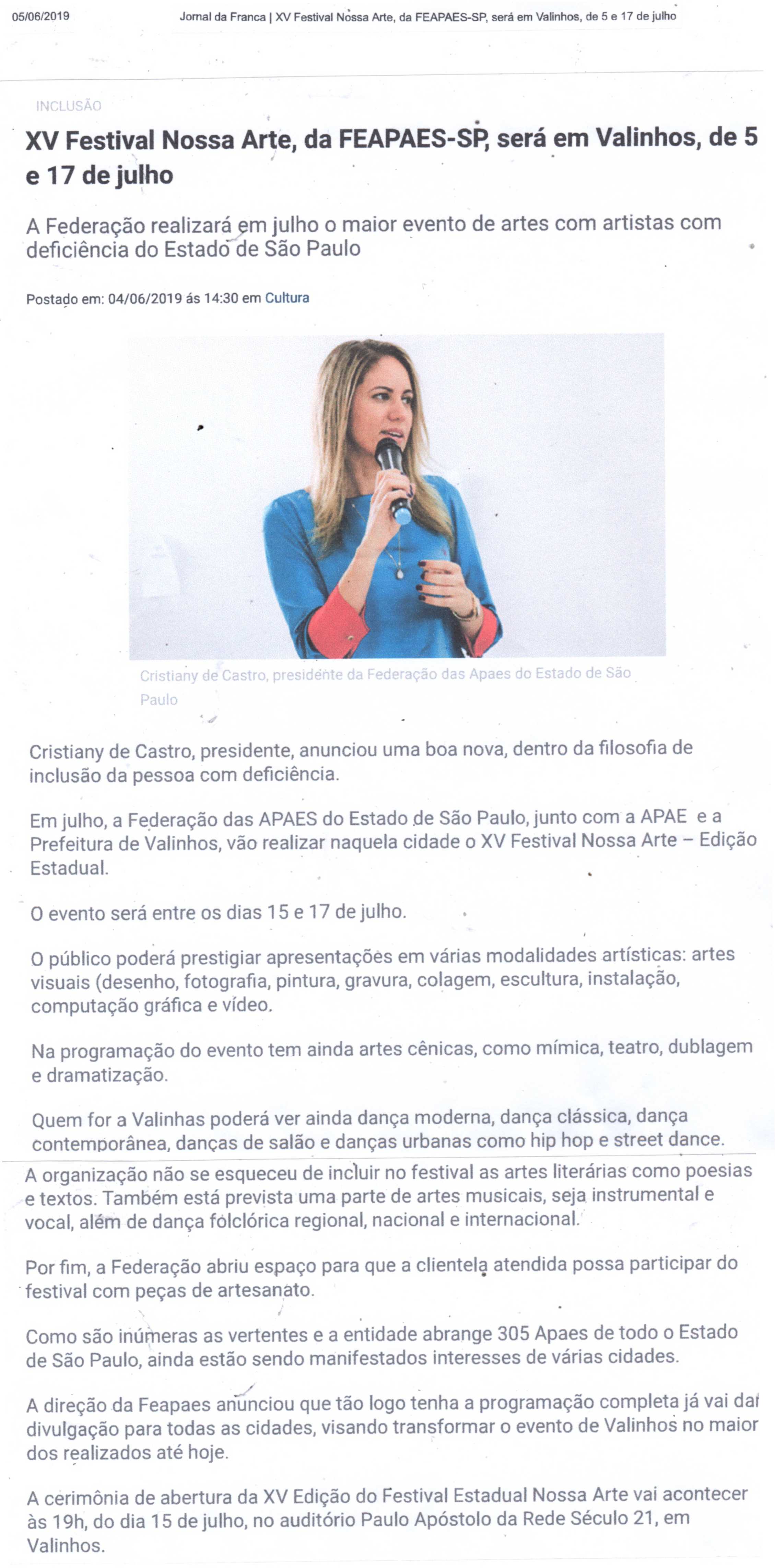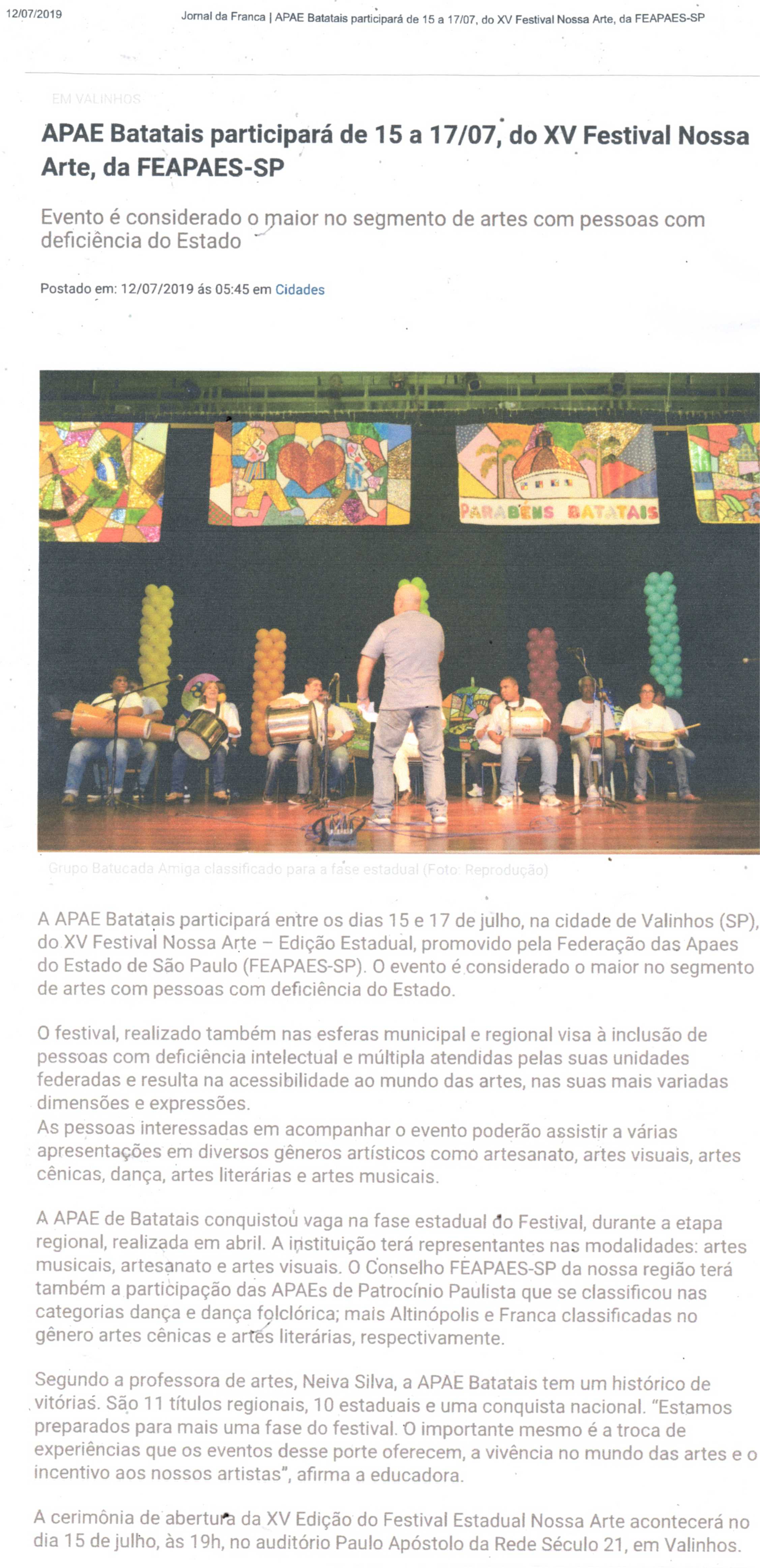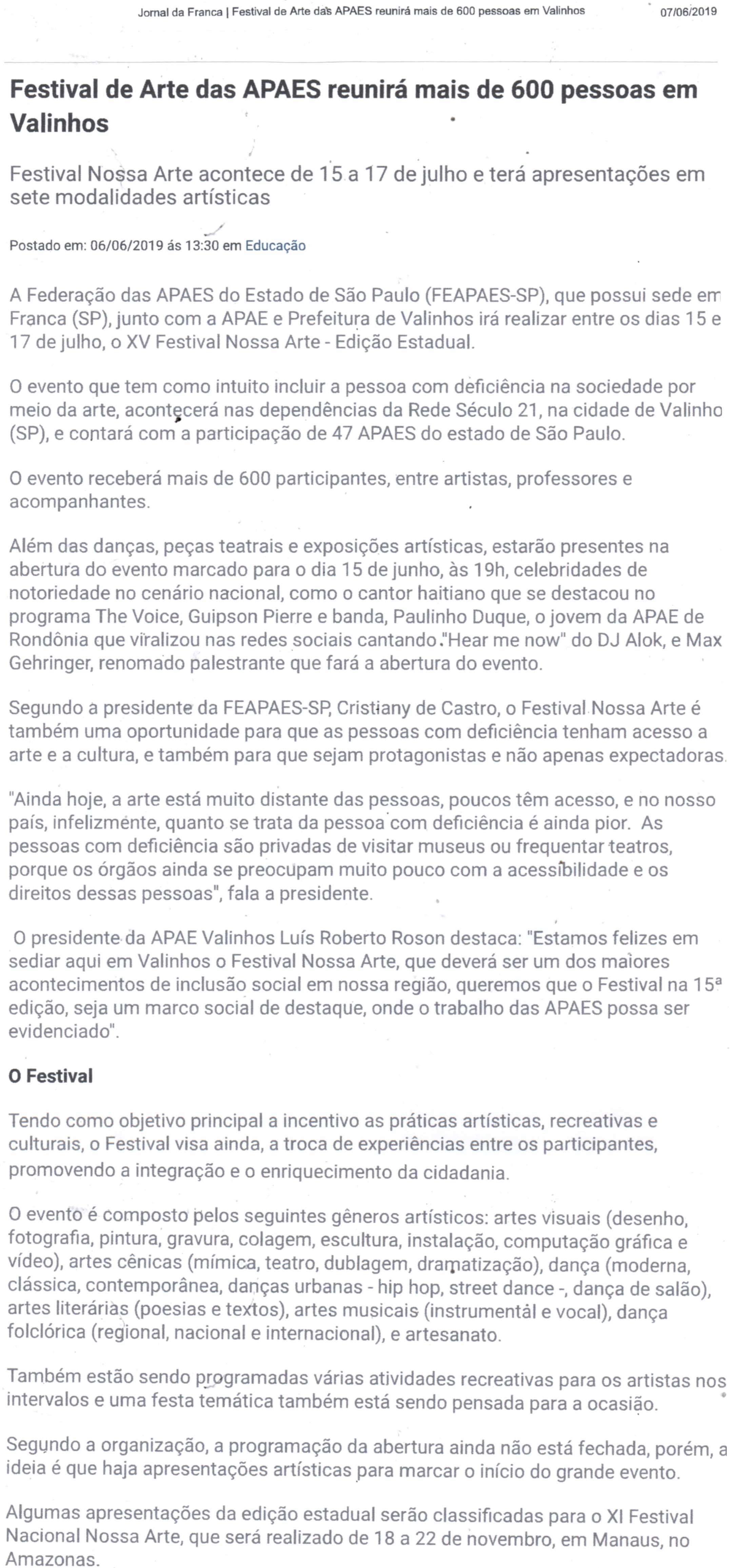 20/07/16 - DIÁRIO DA FRANCA - Apae participará de um festival estadual de artes - 2007-dia...