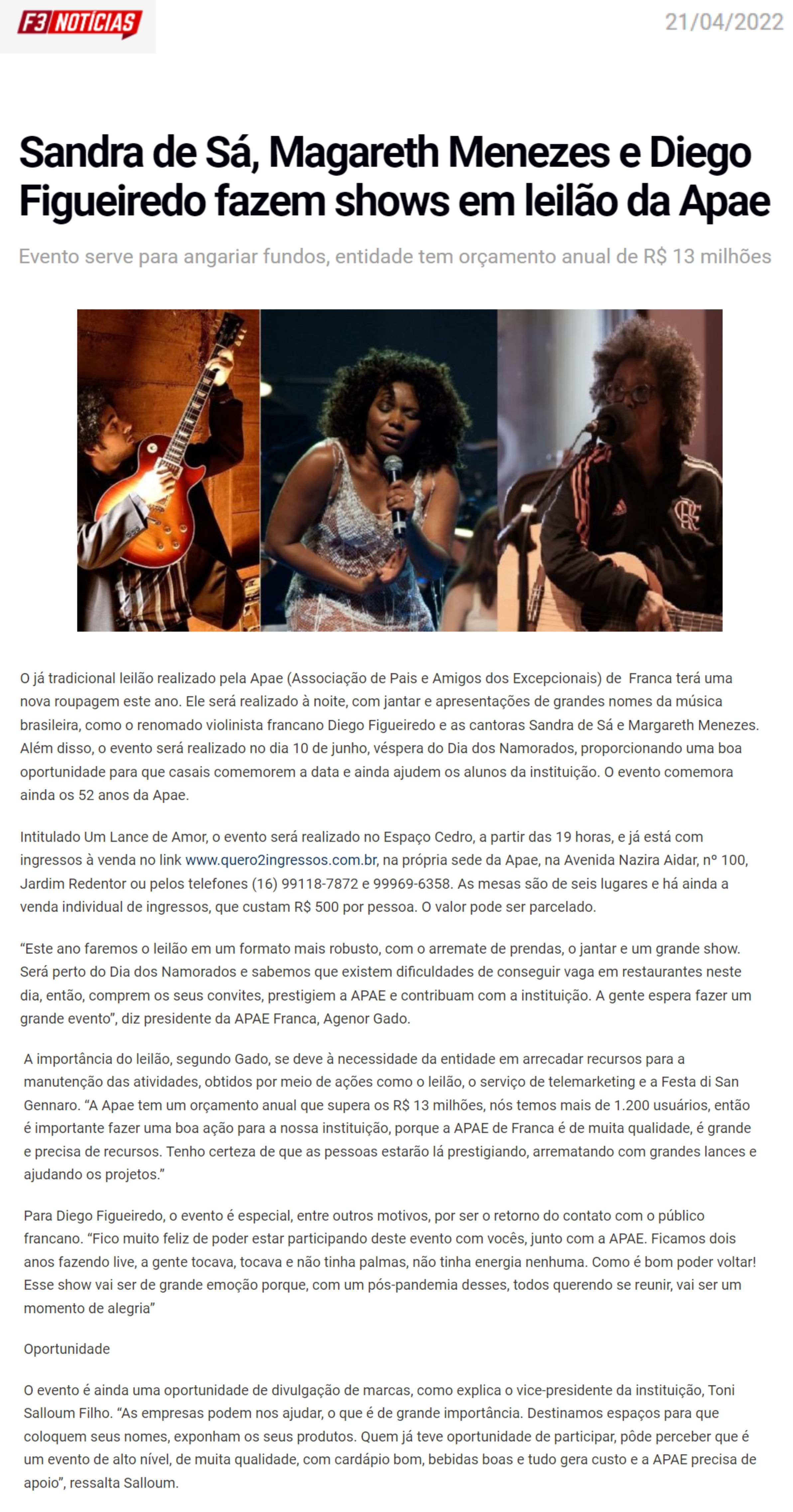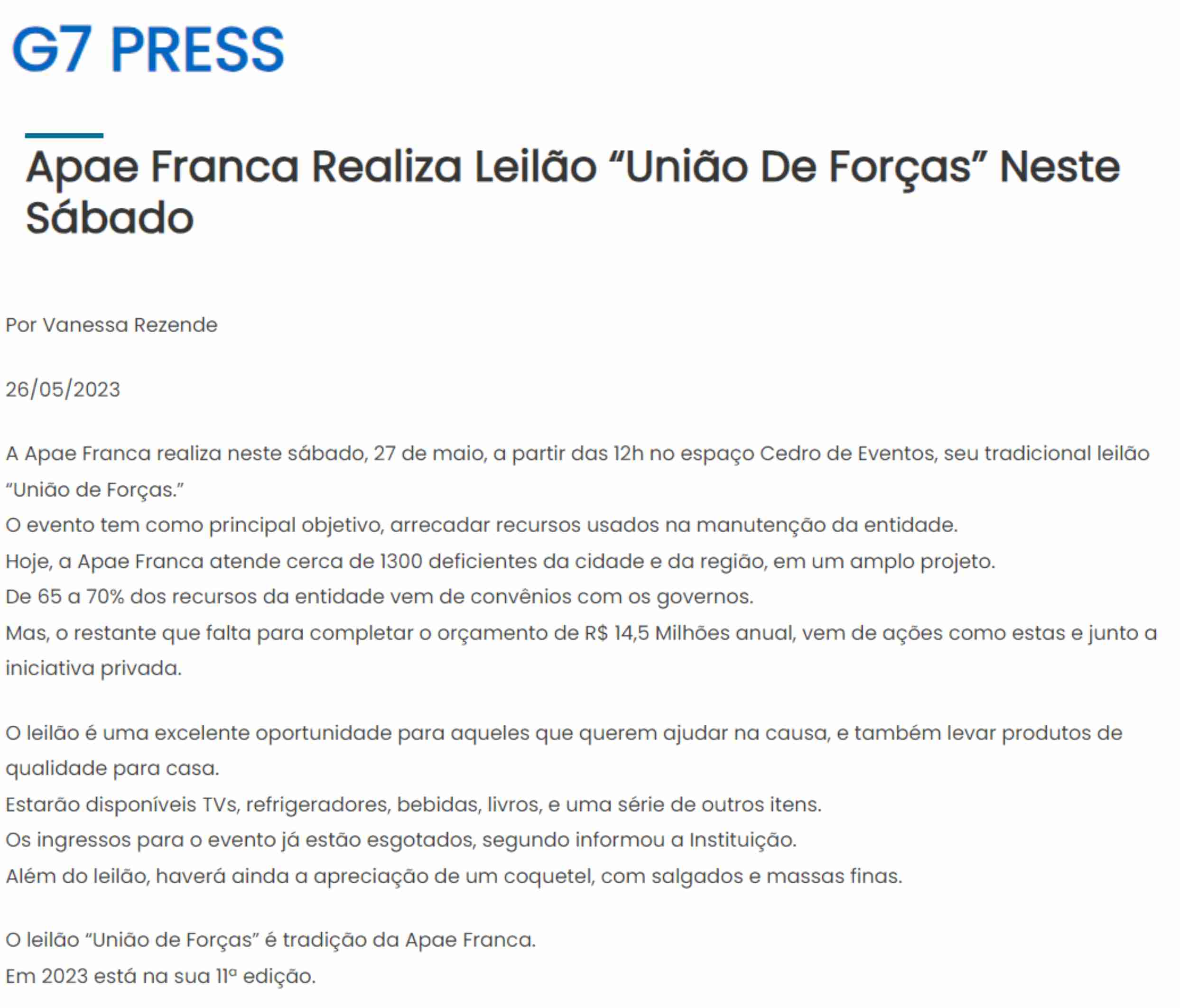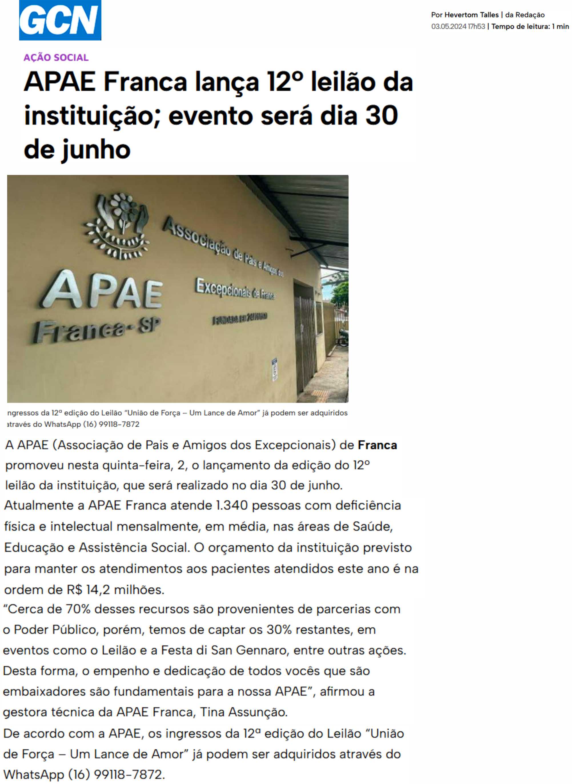 15.05.25 F3 Notícias APAE Franca faz leilão no dia 24.5 para ampliar atendimento para mais...