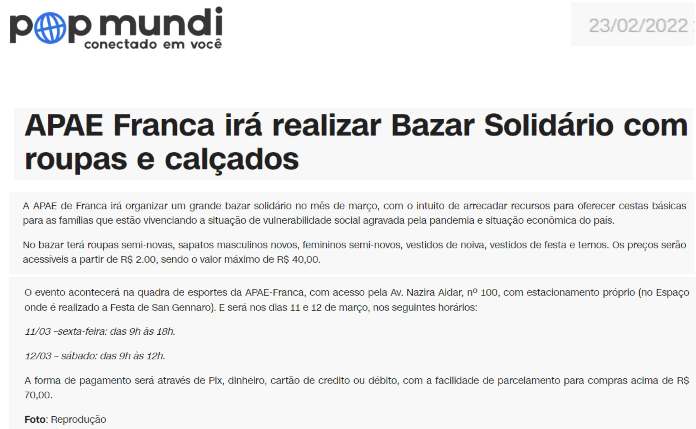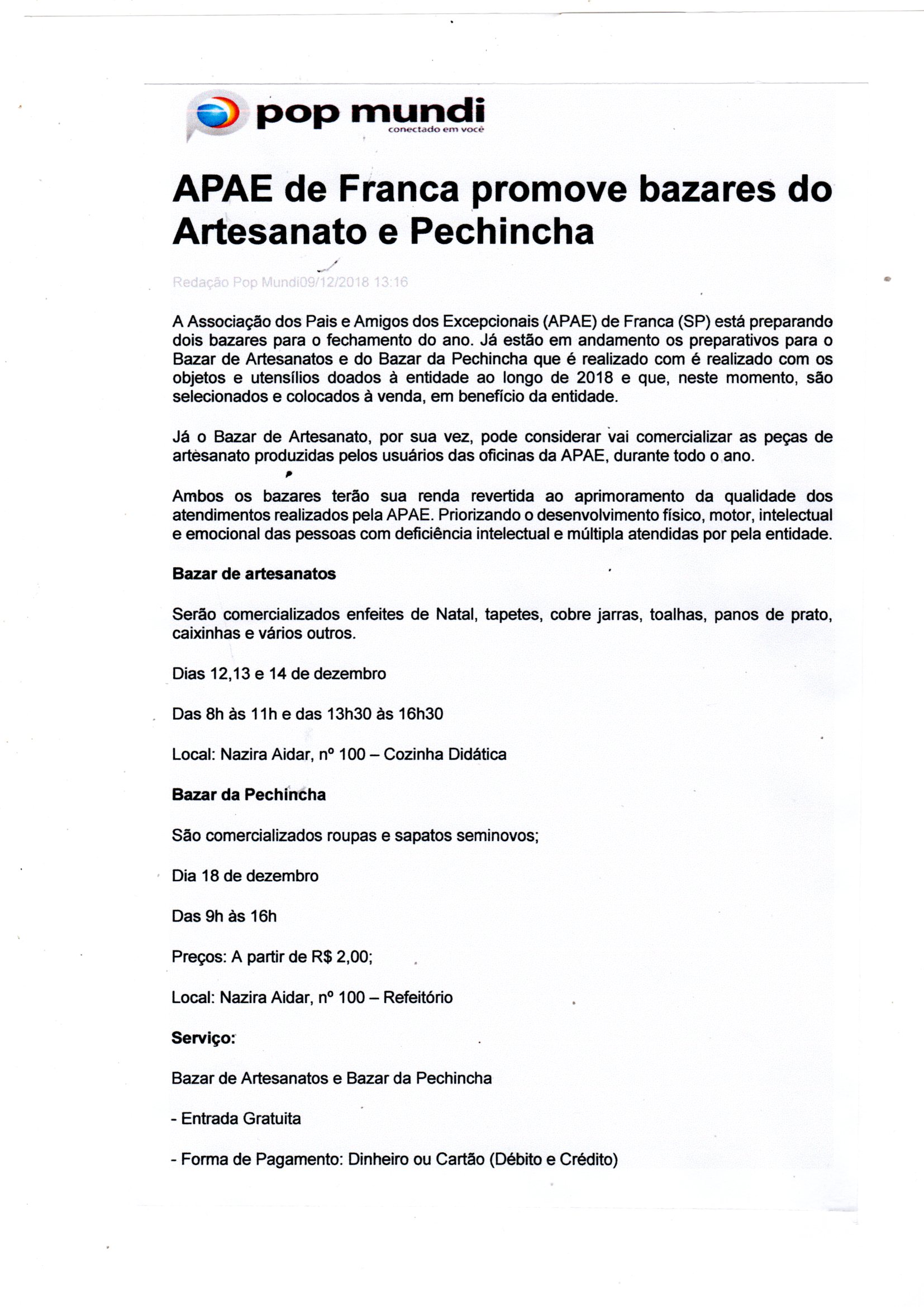 02.07.25 Pop Mundi APAE realiza Bazar de Quitutes nesta sexta, em prol da Barraca da Foga...