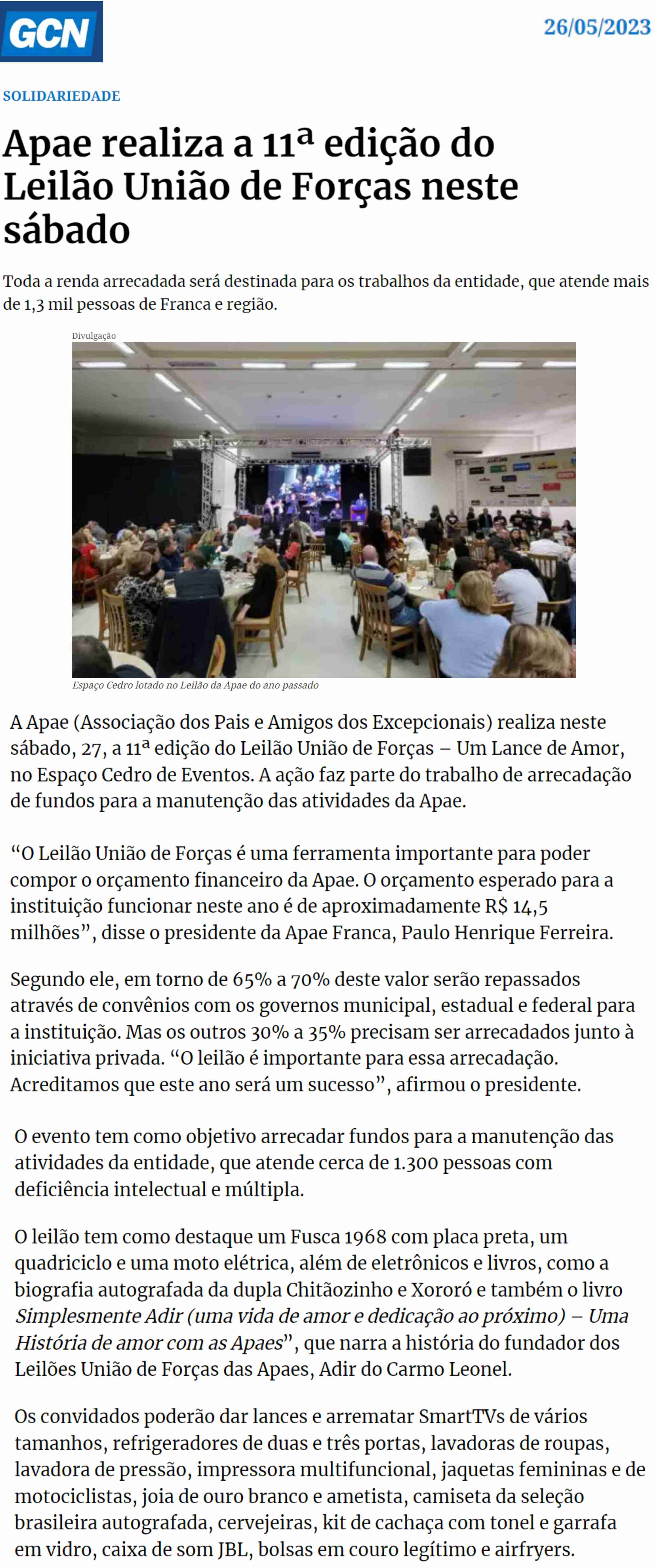 14.05.25 Notícias de Franca Notícias de Franca APAE Franca promove 13º Leilão Um Lance de...