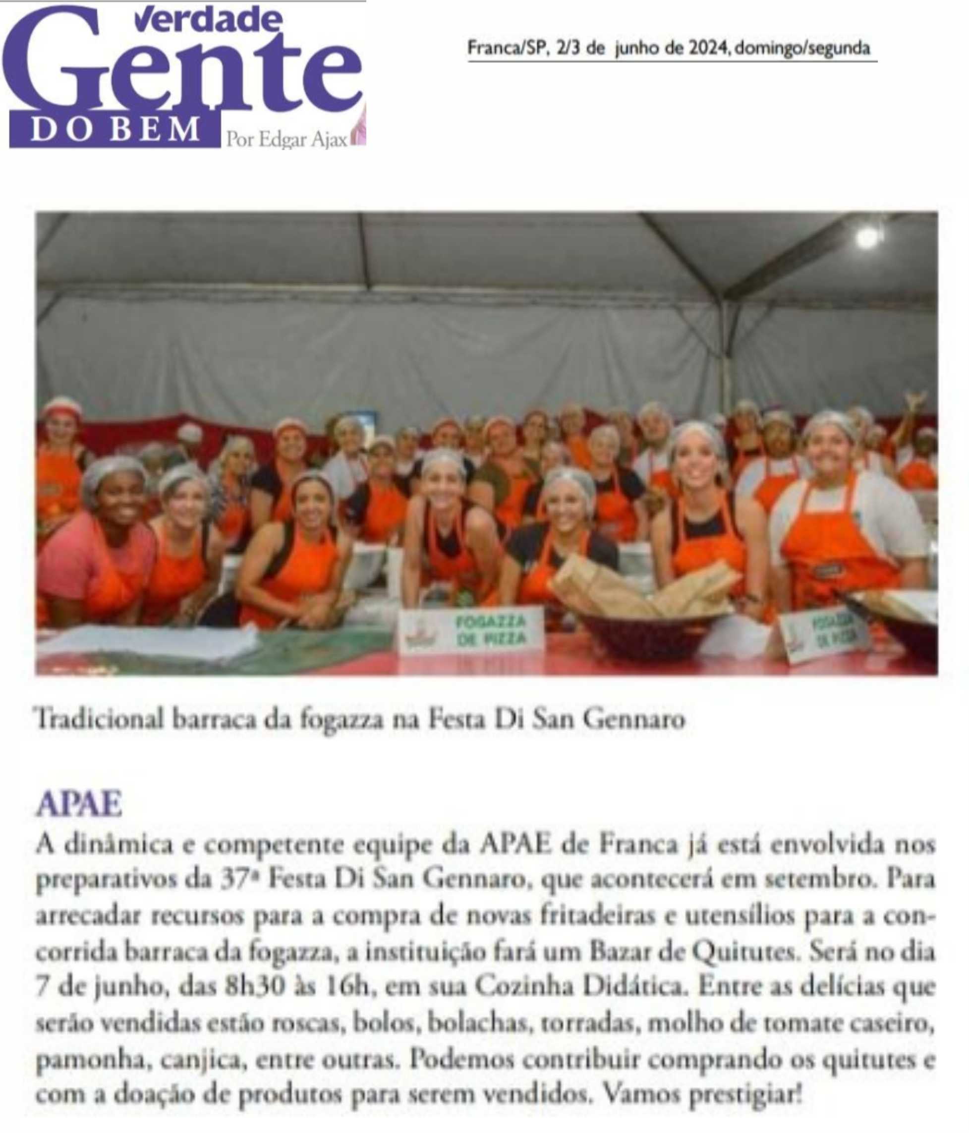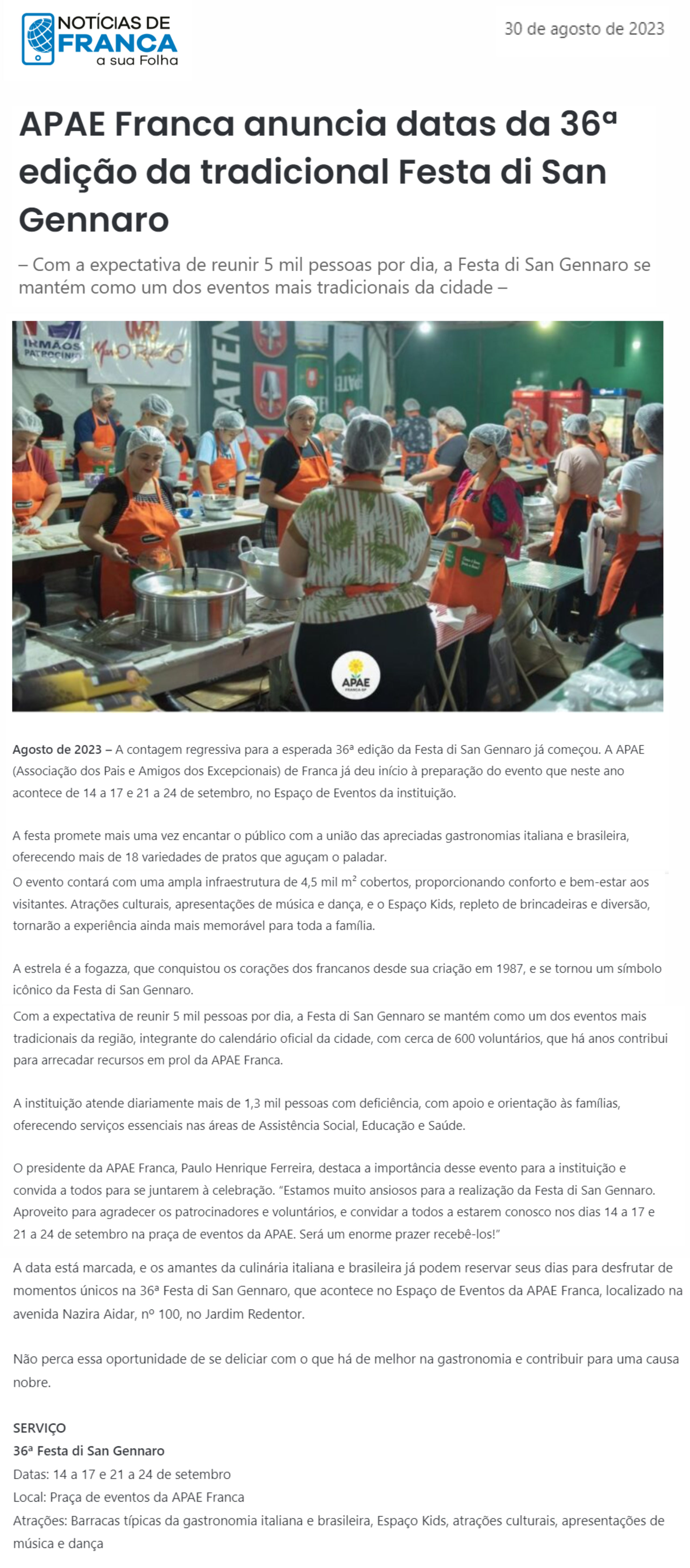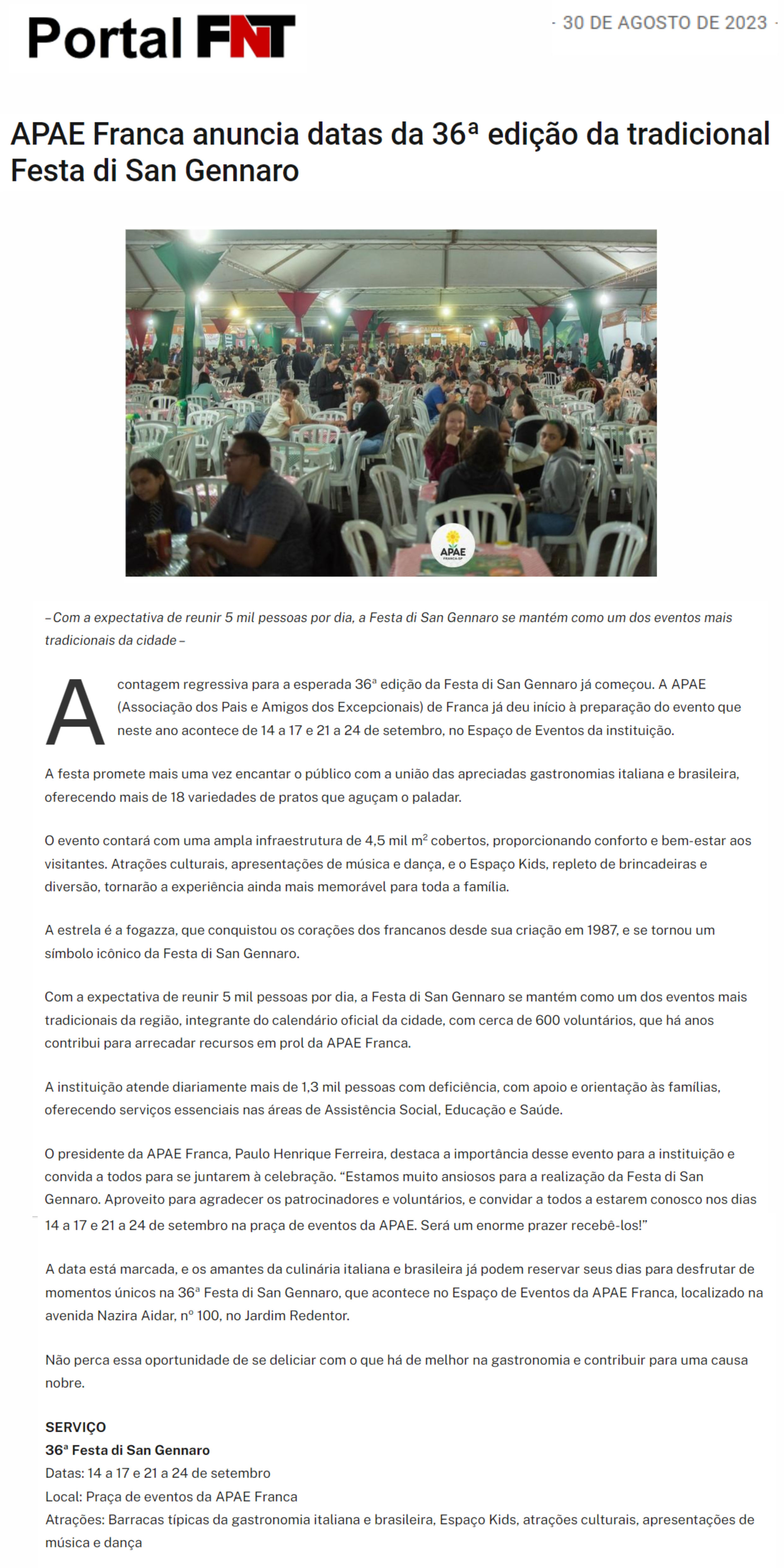 20.08.25 portal fnt APAE Franca realiza Festa di San Gennaro em setembro com novidades e s...