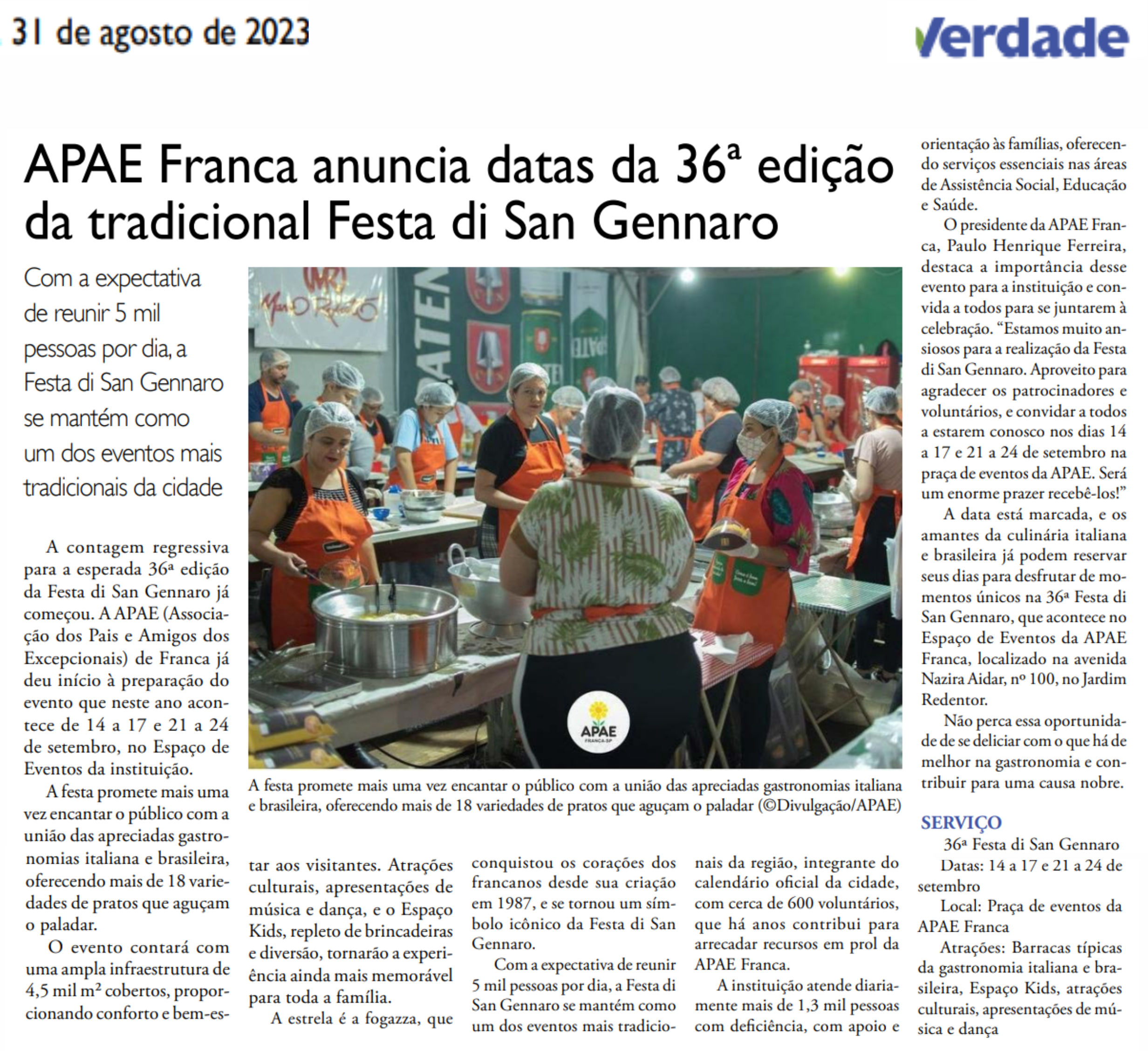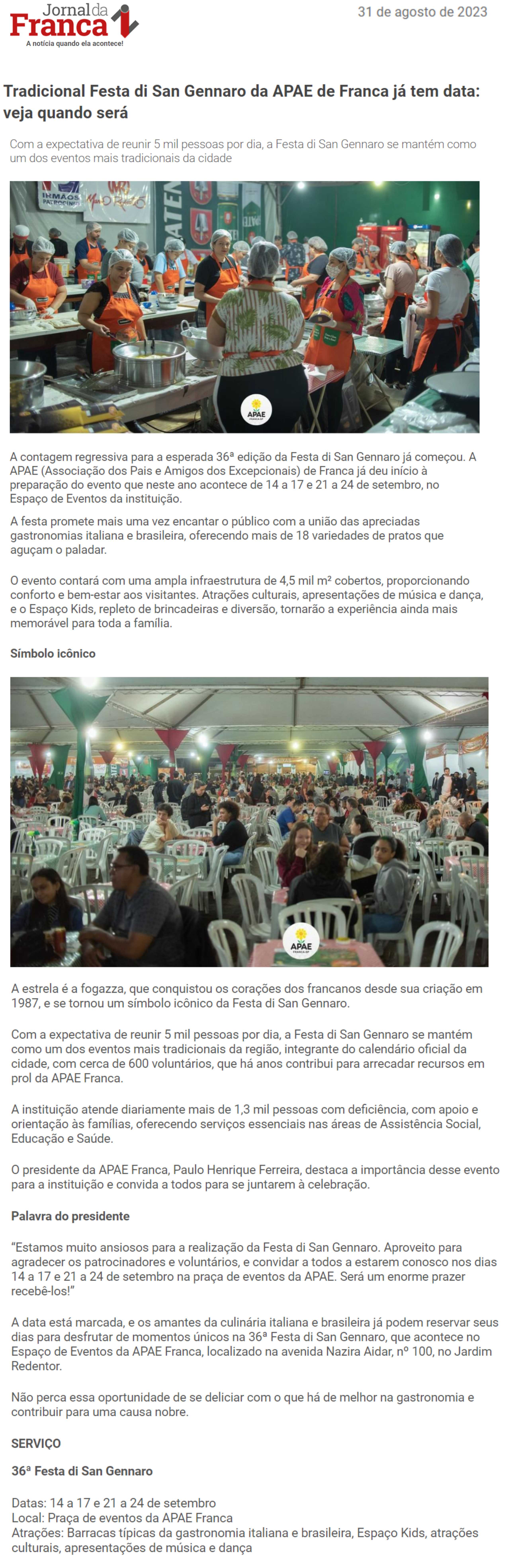21.08.2025 Jornal da Franca APAE Franca marca Festa di San Gennaro em setembro com novidad...