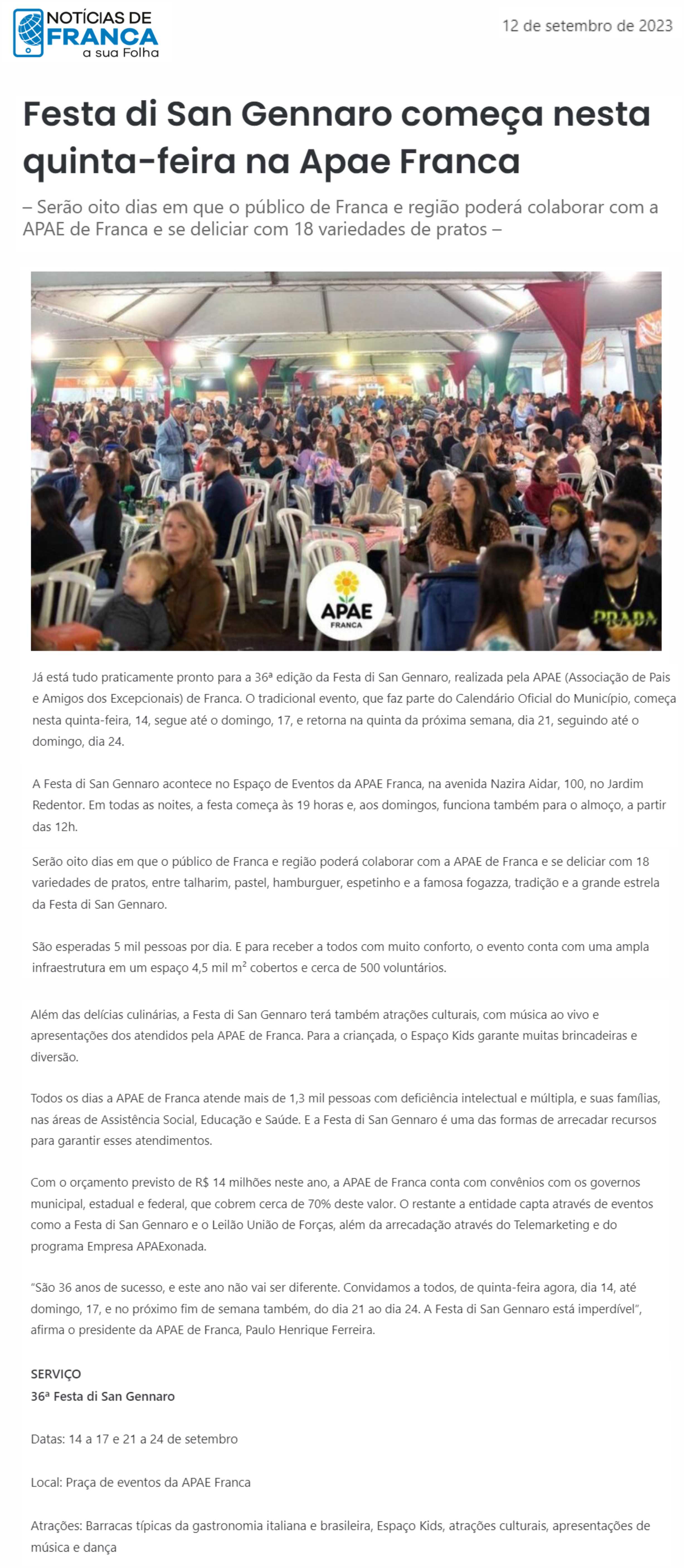 20.09.2025 ACIF Franca APAE Franca realiza Festa Di San Gennaro em setembro com novidades...