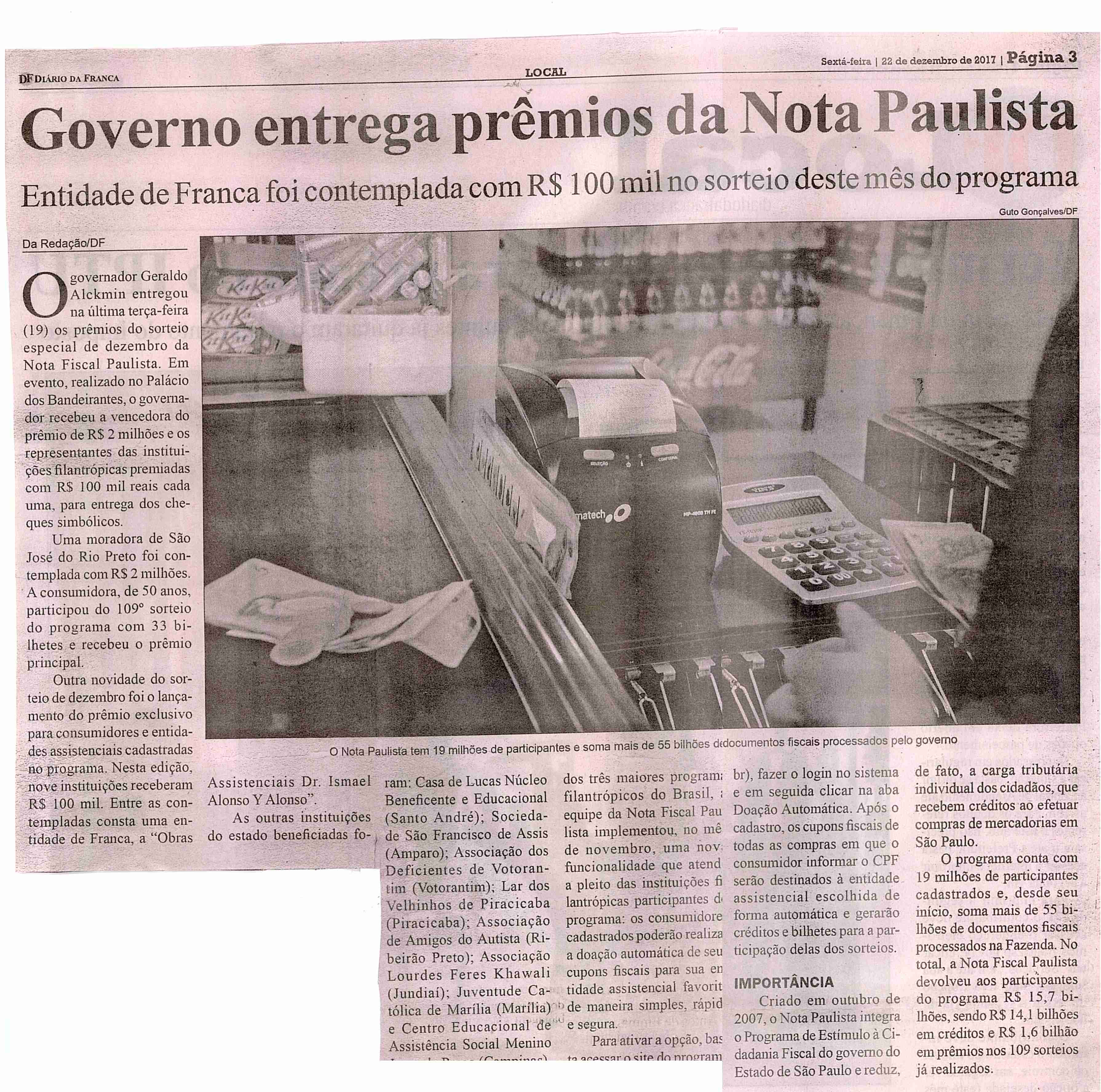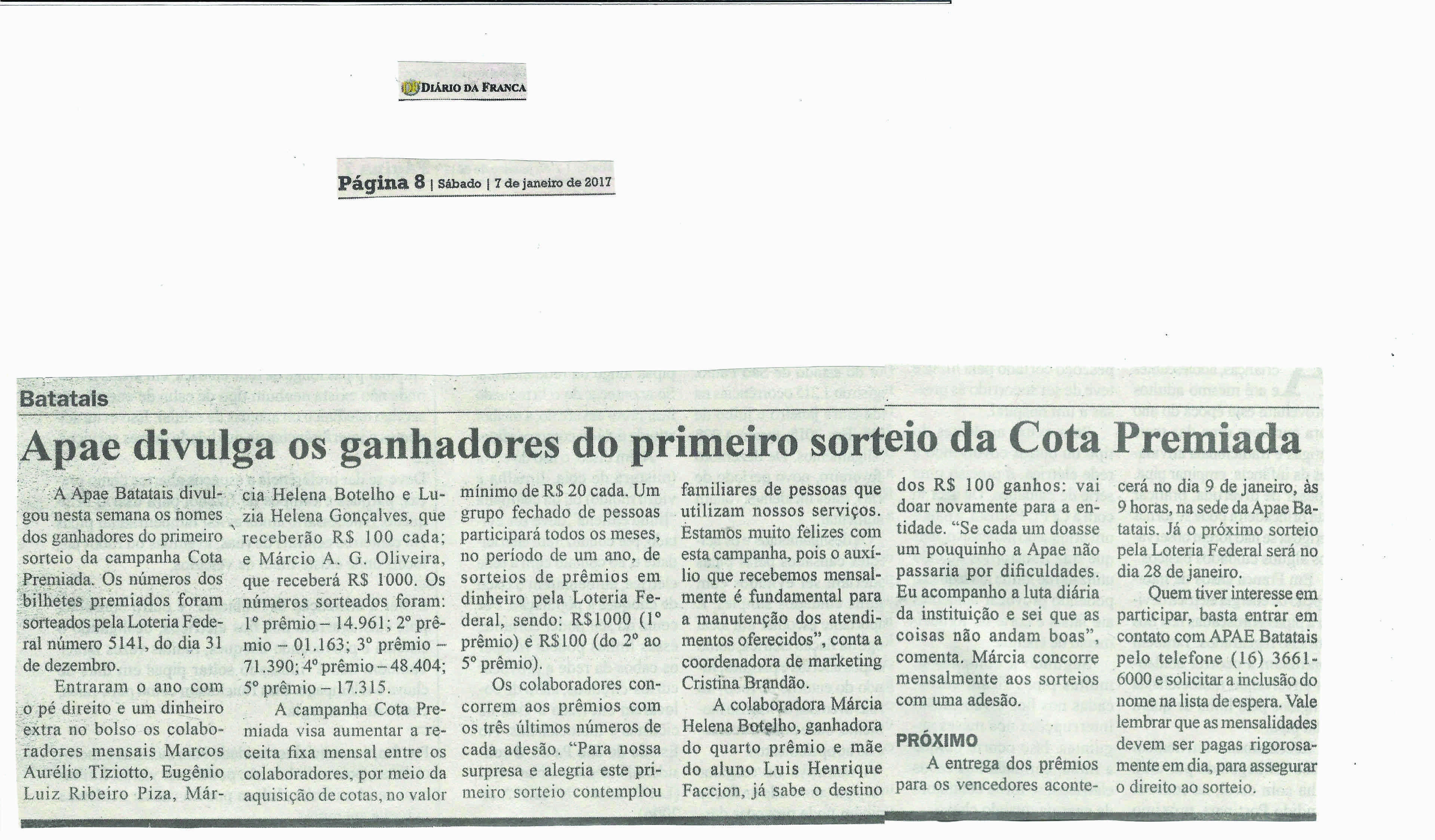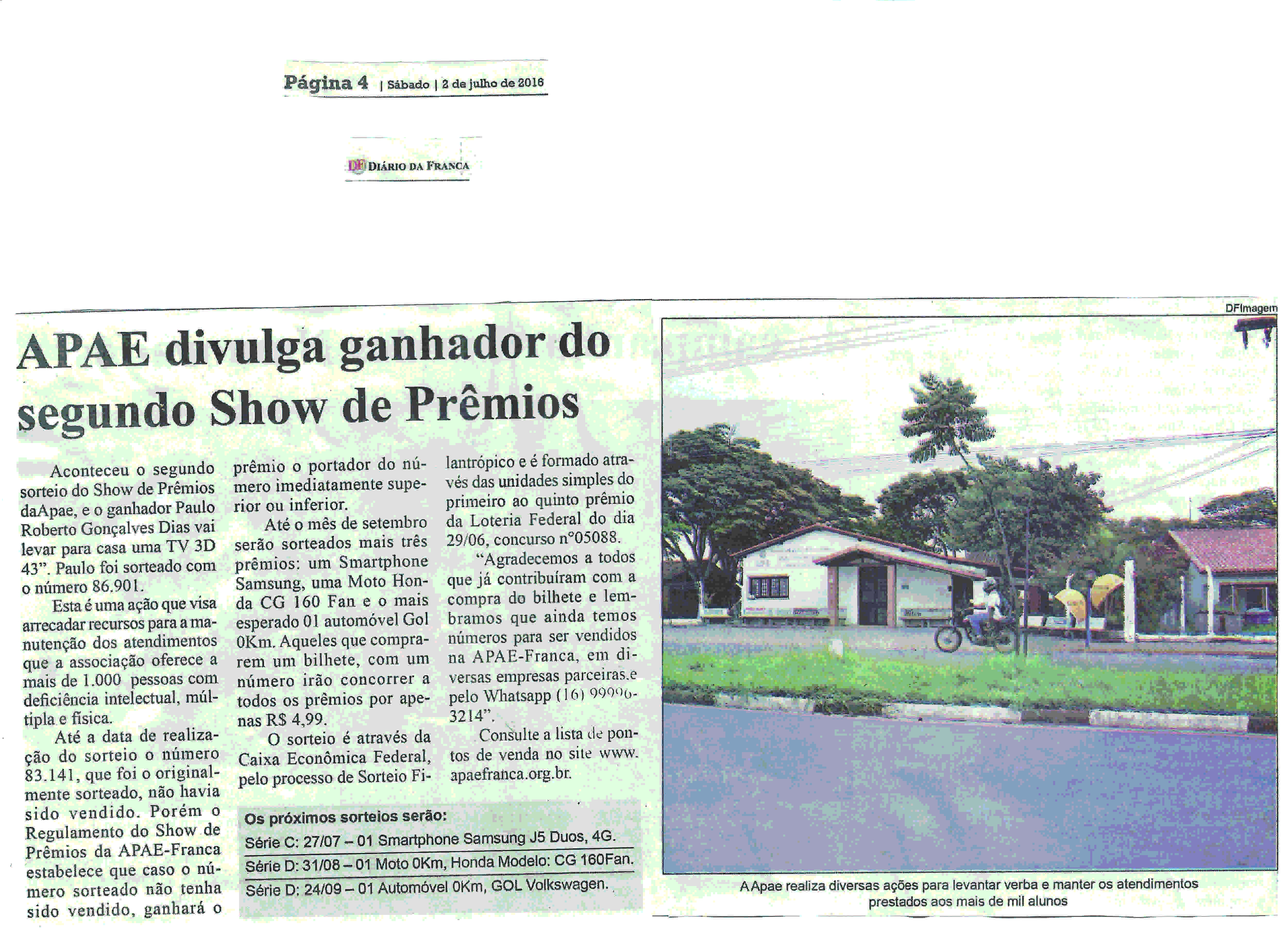 02/07/16 - DIÁRIO DA FRANCA - Apae divulga ganhador do segundo Show de Prêmios - 0207-diar...