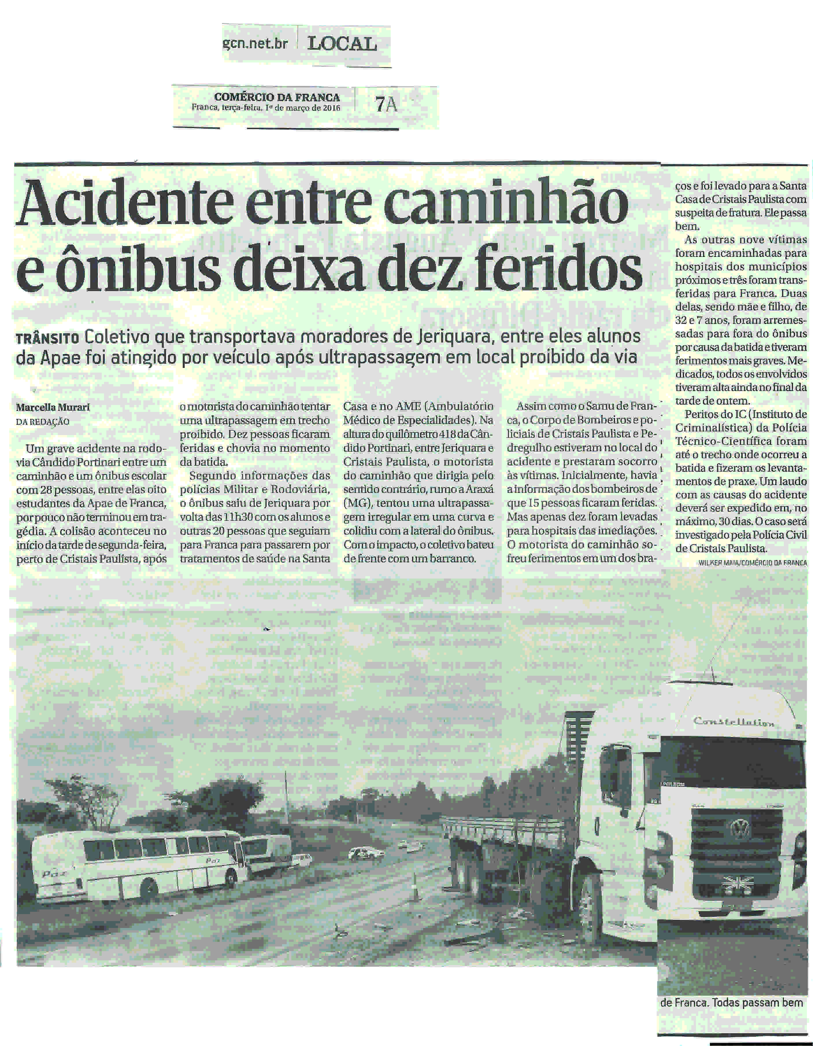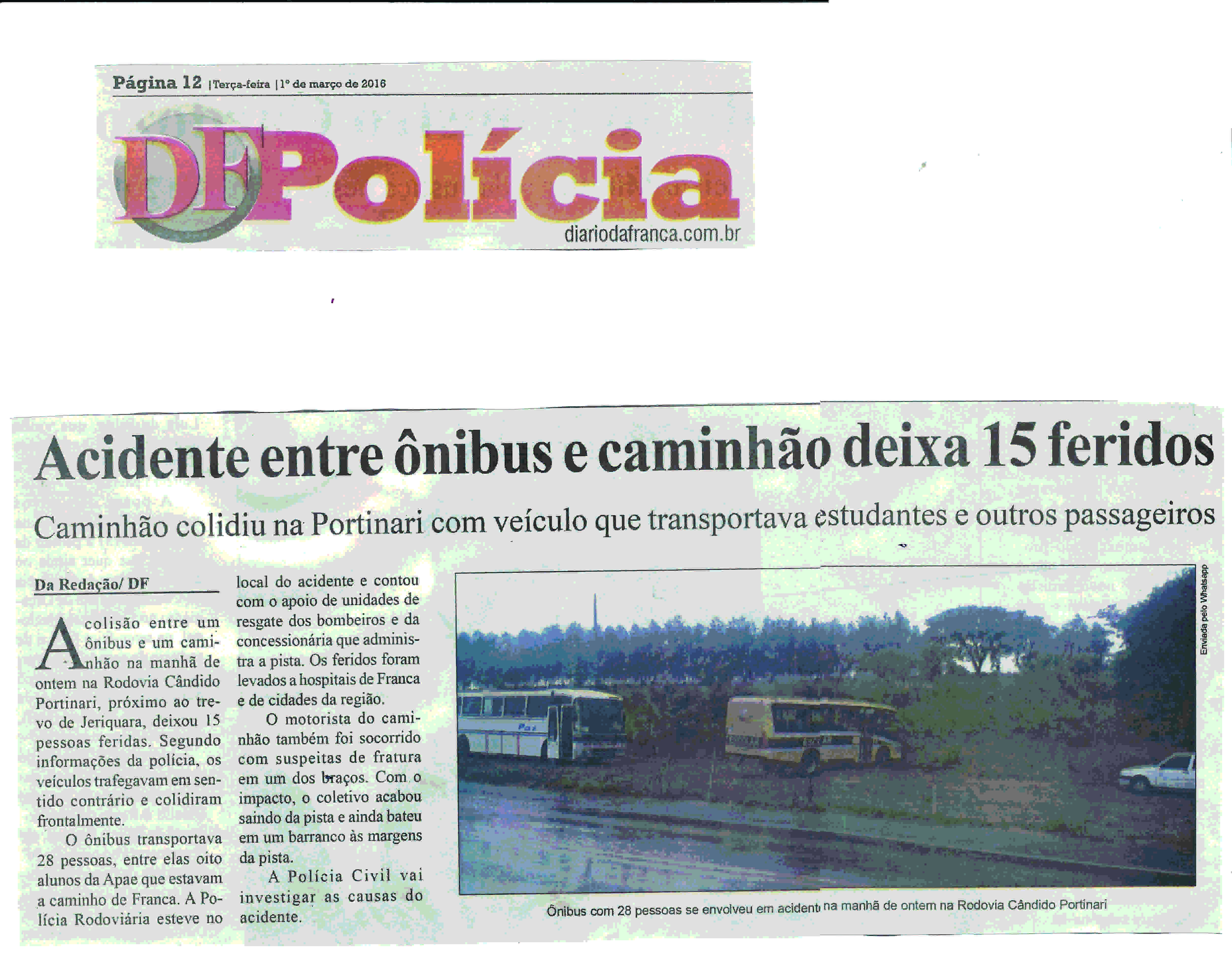 01/03/16 - DIÁRIO DA FRANCA - Ônibus com alunos da Apae colide e deixa 15 pessoas feridas...