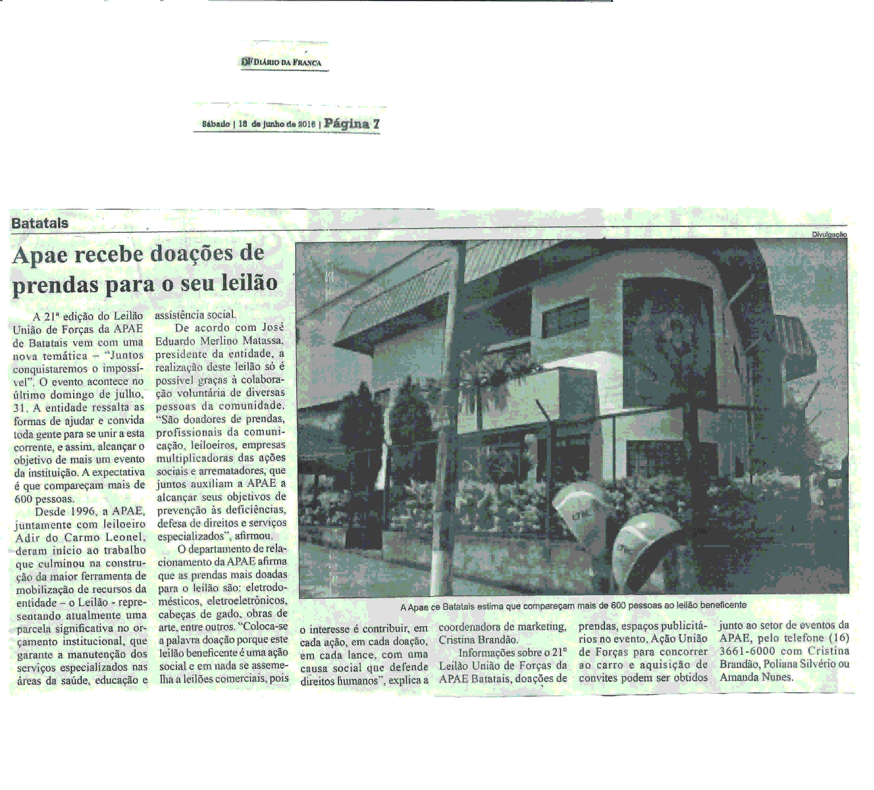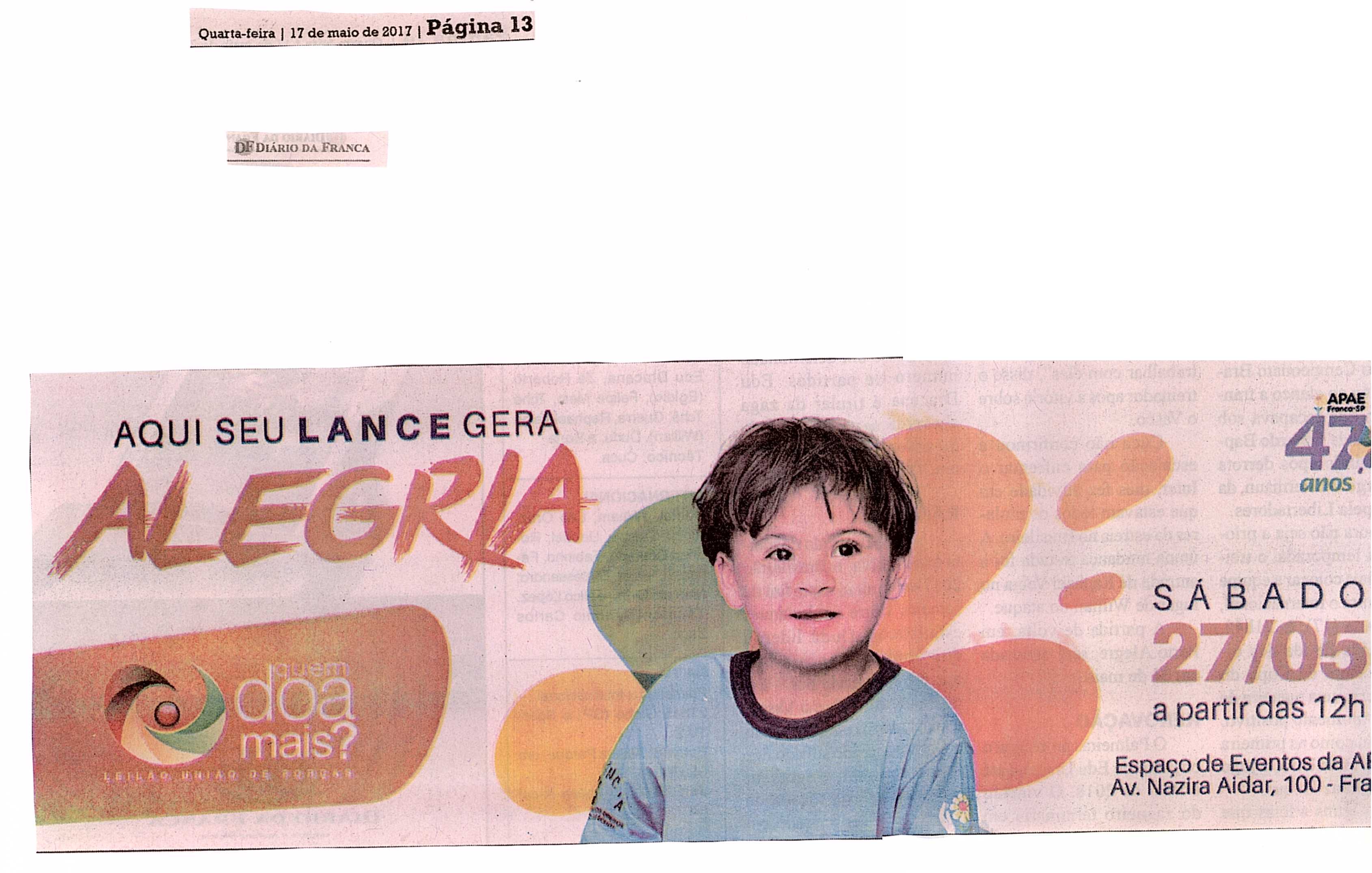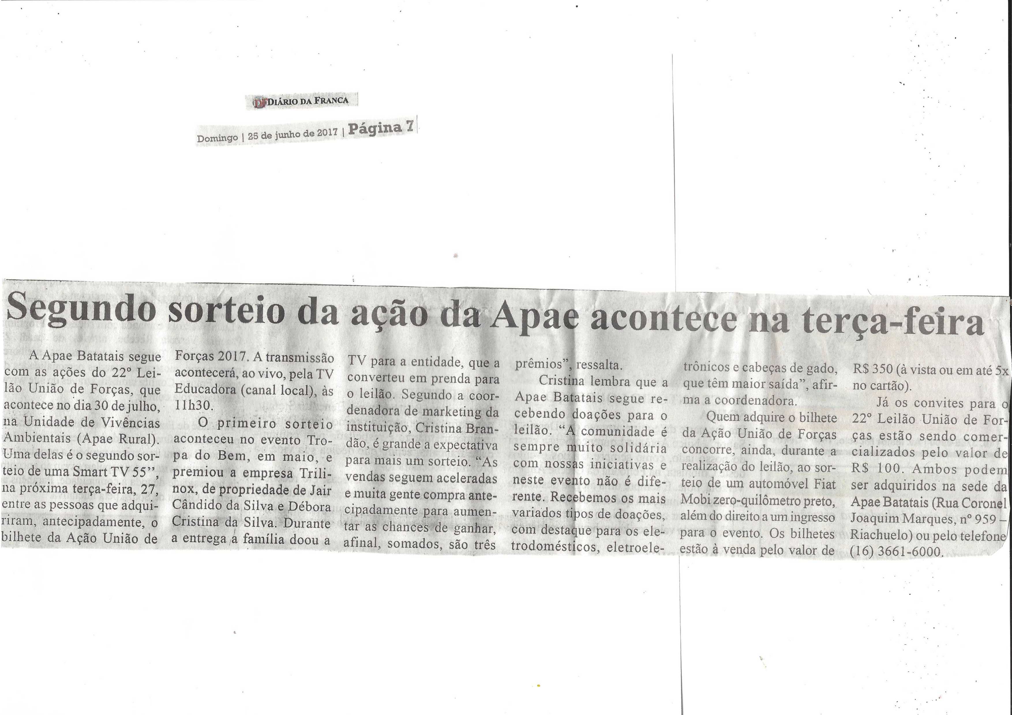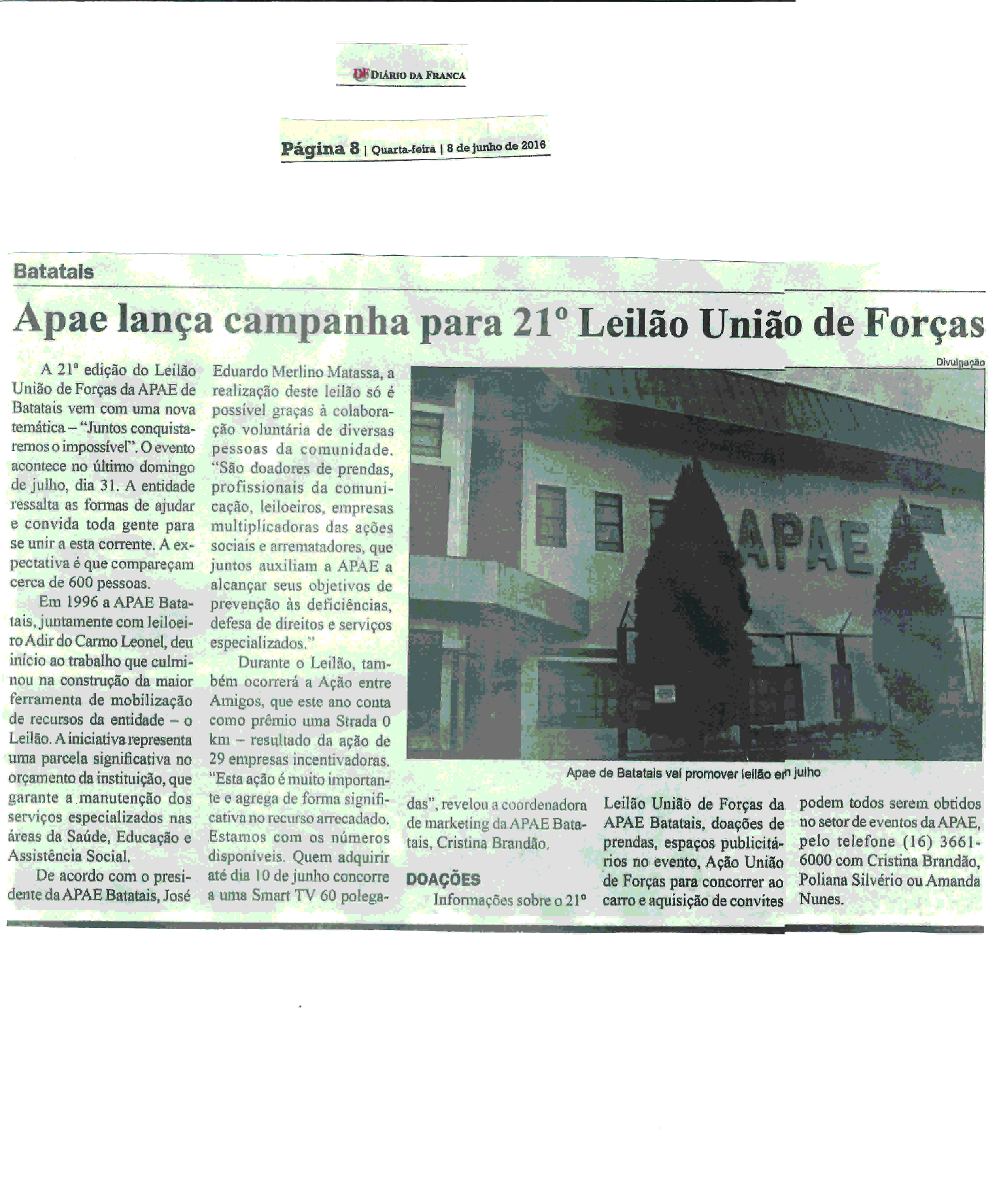 08/06/16 - DIÁRIO DA FRANCA - Apae lança campanha para 21º Leilão União de Forças - 0806-d...