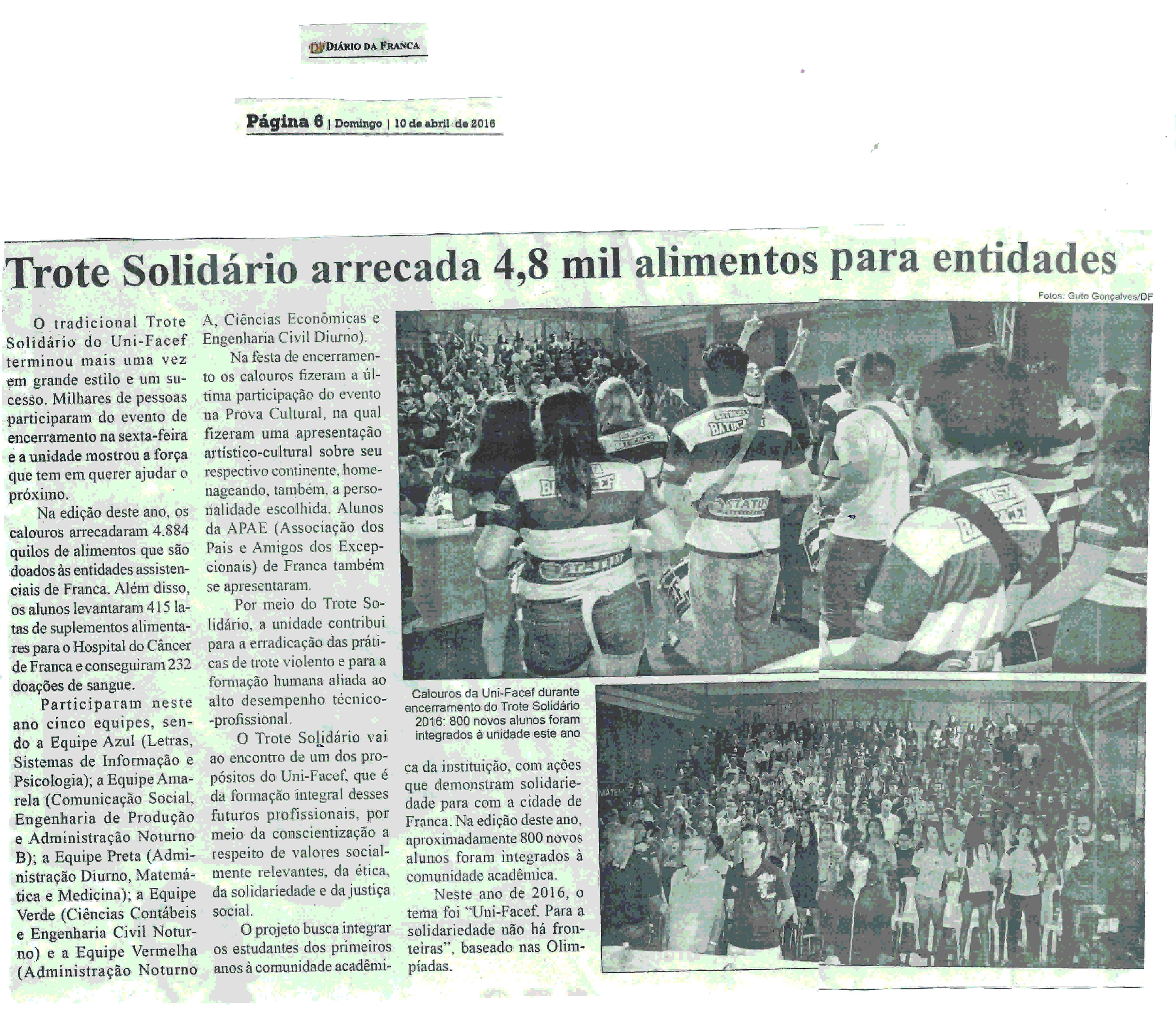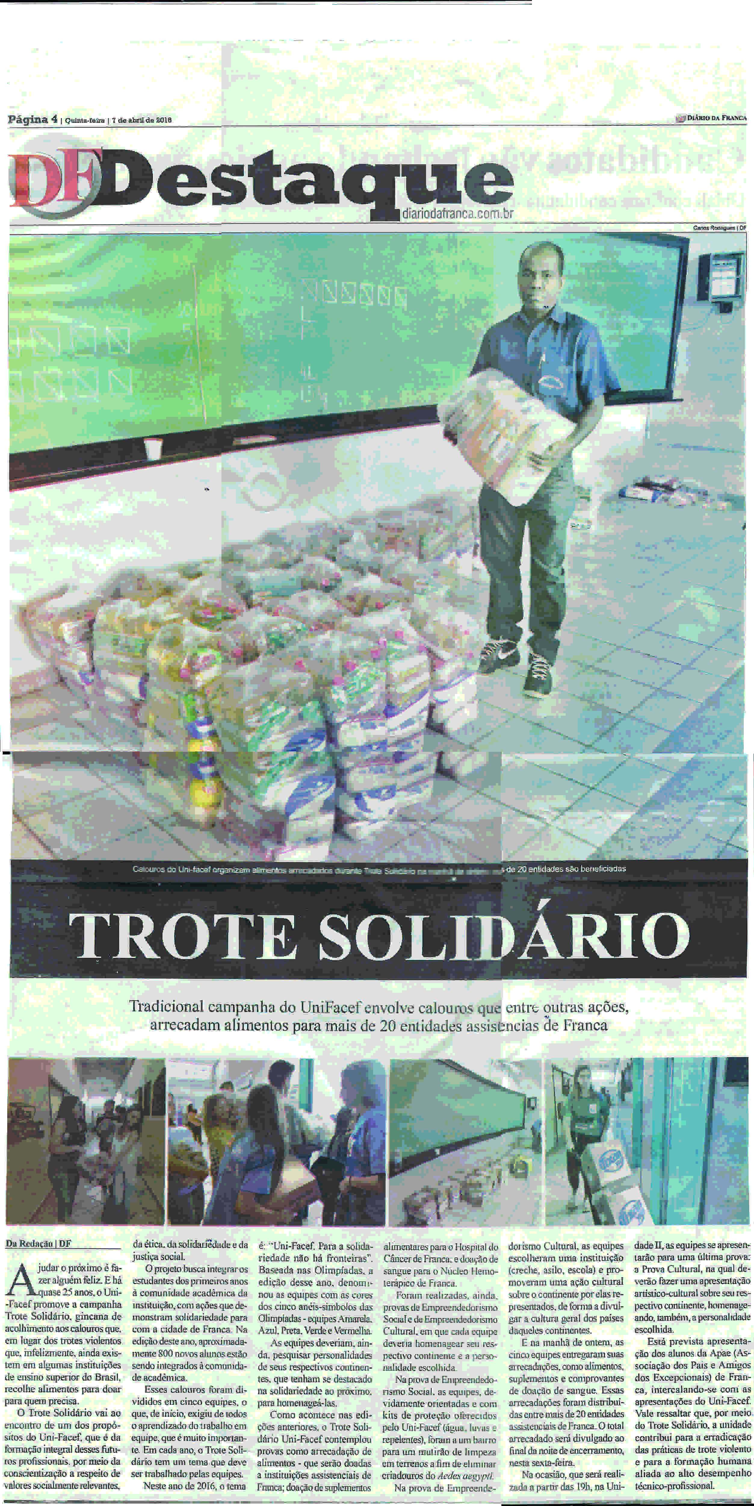 10/04/16 - DIÁRIO DA FRANCA - Trote Solidário arrecada 4,8 mil alimentos para entidades -...