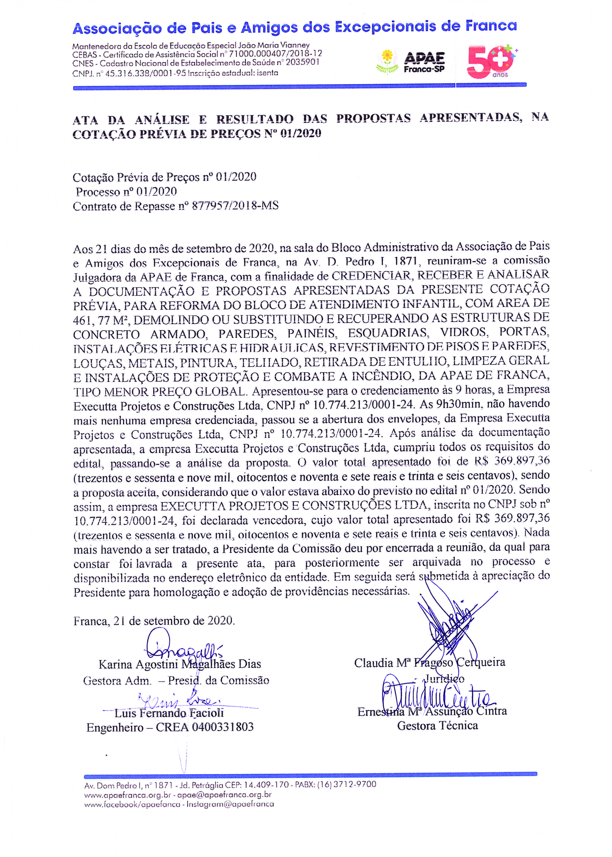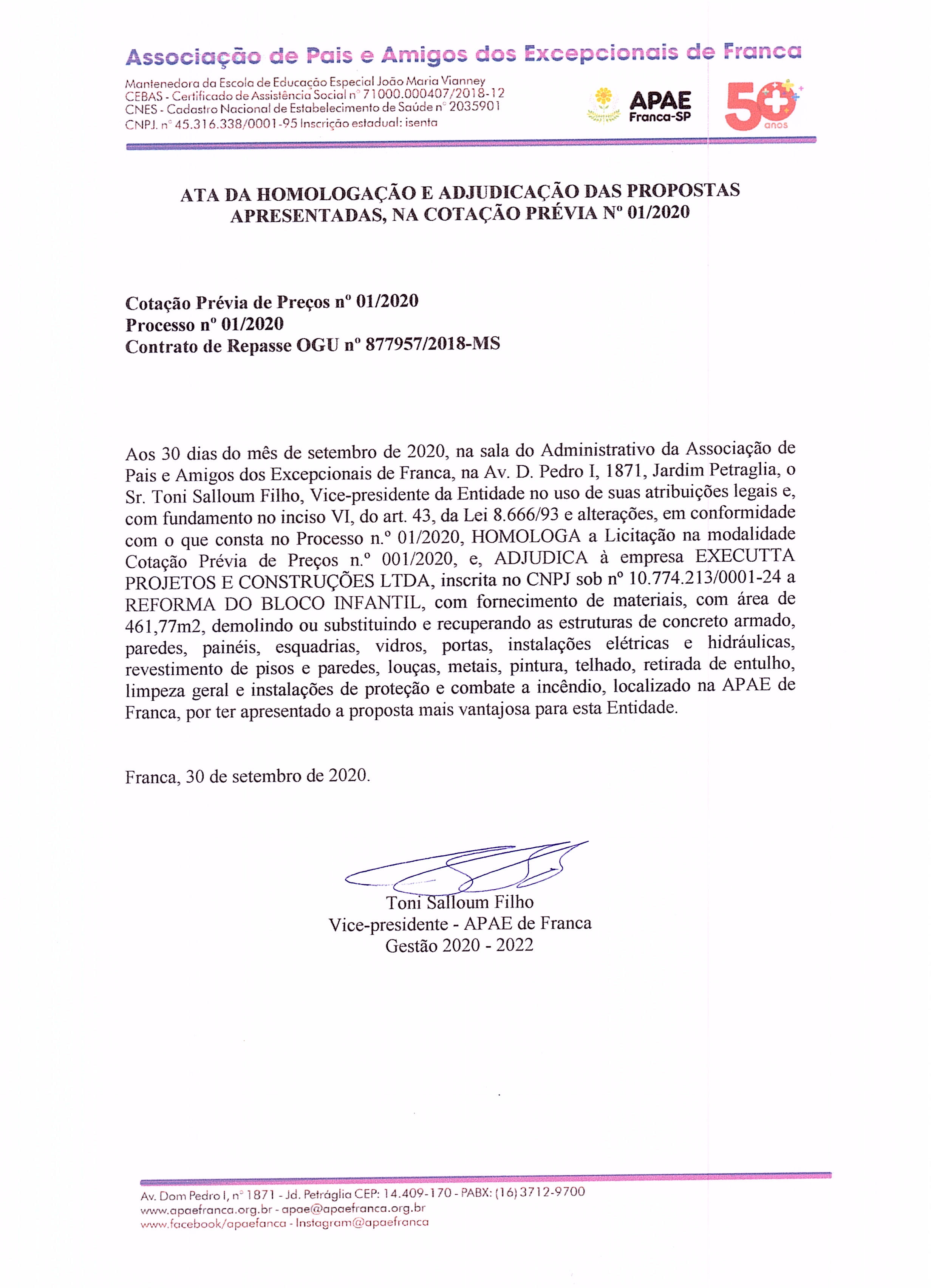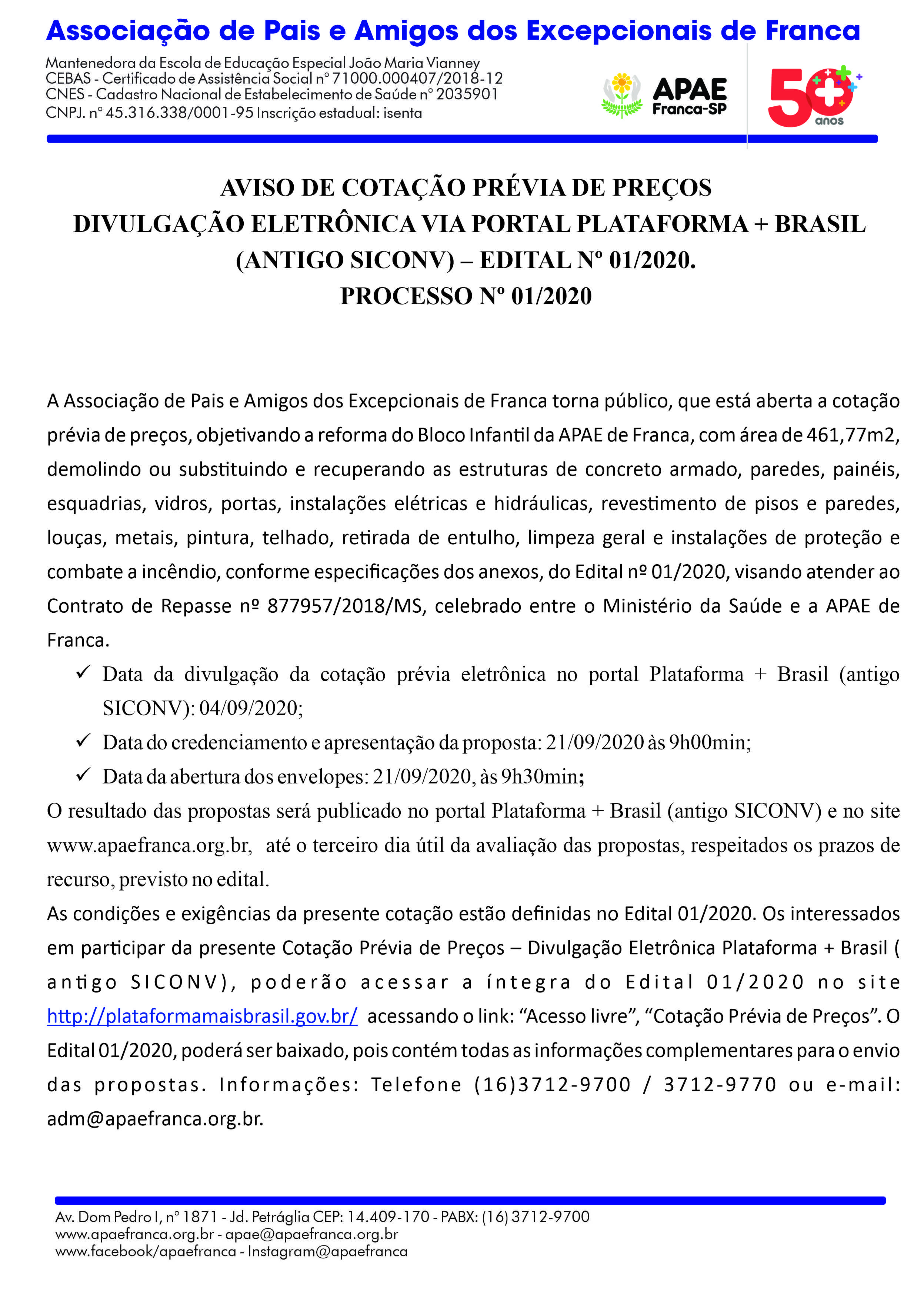 COTAÇÃO PRÉVIA DE PREÇOS DIVULGAÇÃO ELETRÔNICA VIA PORTAL PLATAFORMA + BRASIL (ANTIGO SICONV) – EDITAL Nº 01/2020. PROCESSO Nº 01/2020