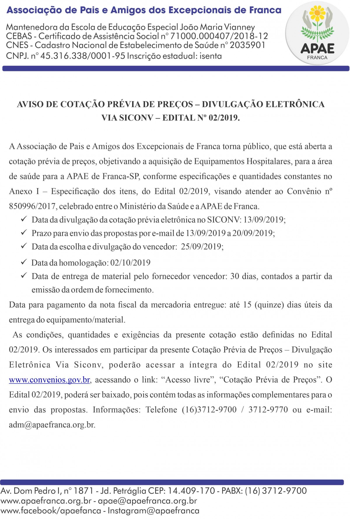 AVISO DE COTAÇÃO PRÉVIA DE PREÇOS – DIVULGAÇÃO ELETRÔNICA VIA SICONV – EDITAL Nº 02/2019