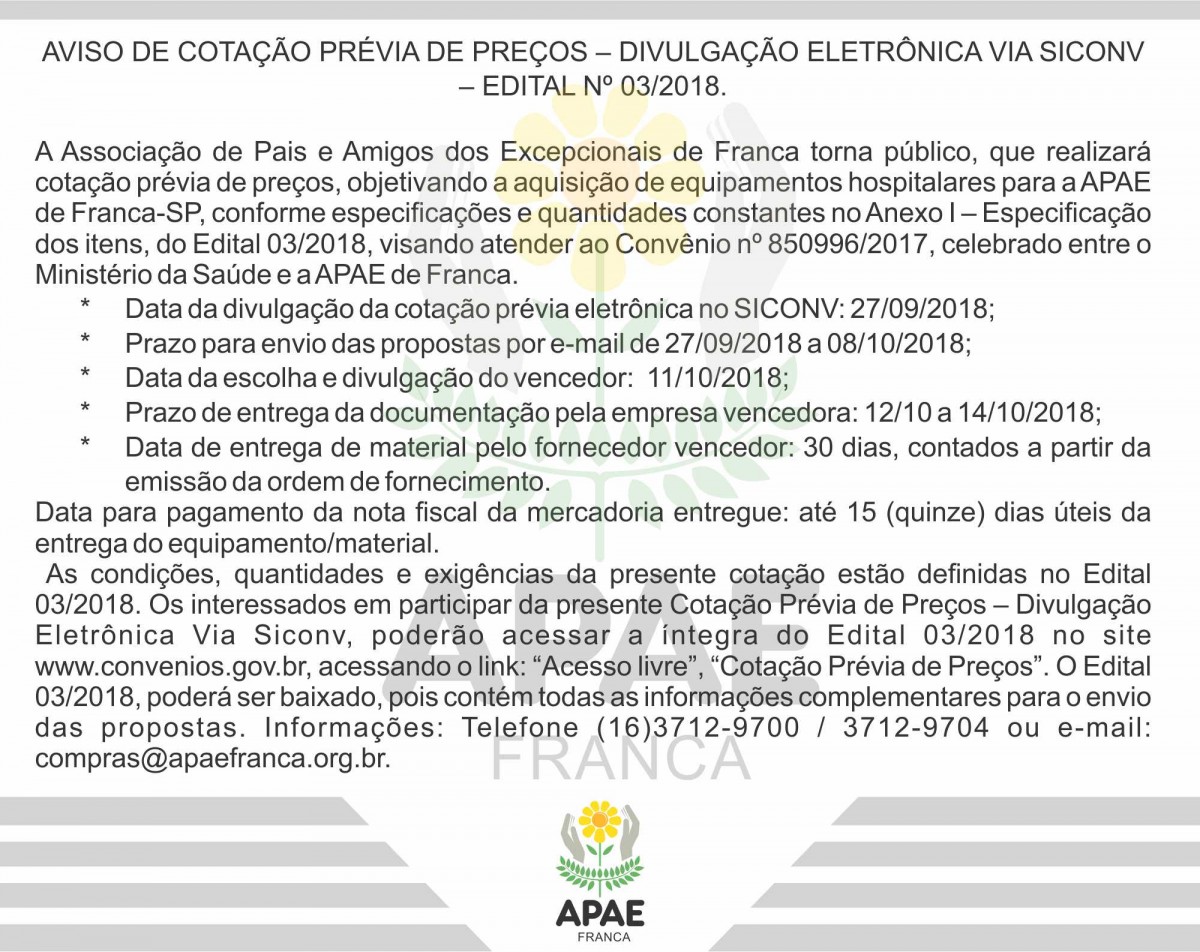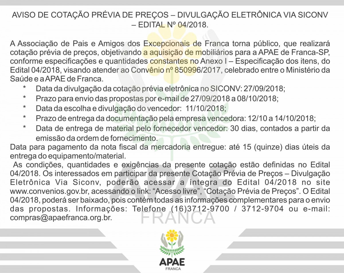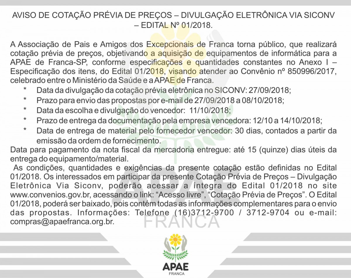 Aviso de Cotação Prévia de preços divulgação eletrônica edital no. 01/18