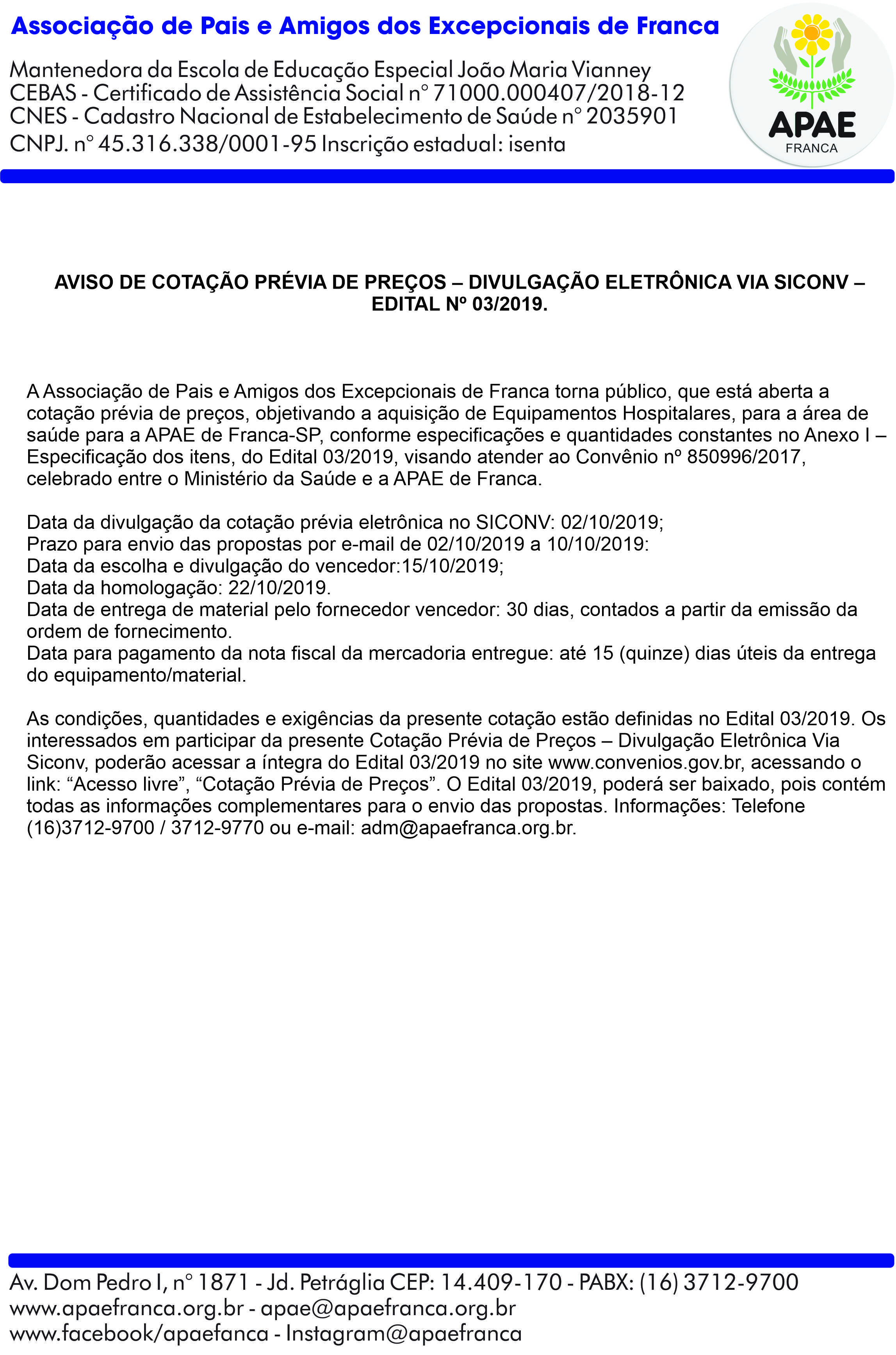 AVISO DE COTAÇÃO PRÉVIA DE PREÇOS – DIVULGAÇÃO ELETRÔNICA VIA SICONV – EDITAL Nº 03/2019